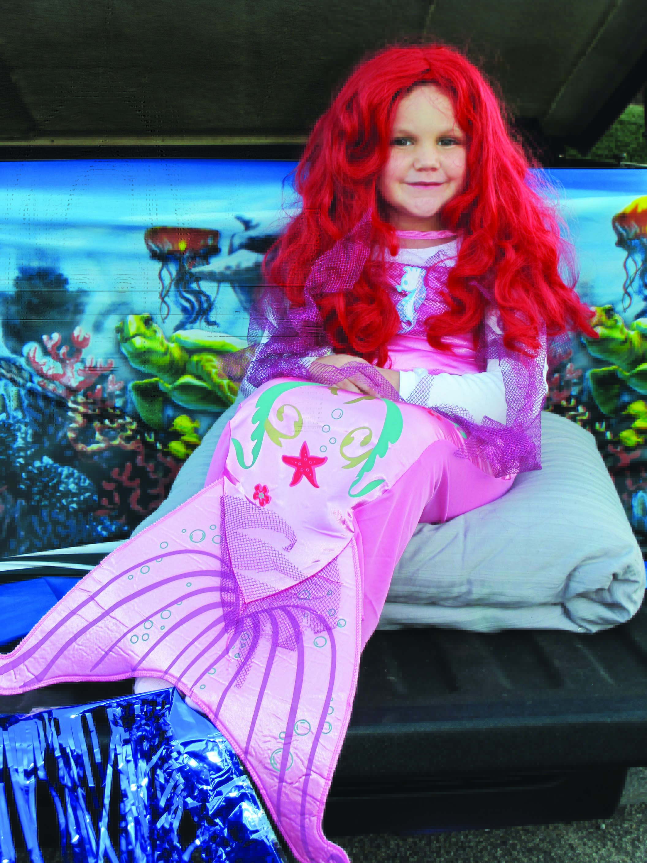 Mermaid Maci King sits atop her undersea trunk-or-treat thrown handing out chips and other treats