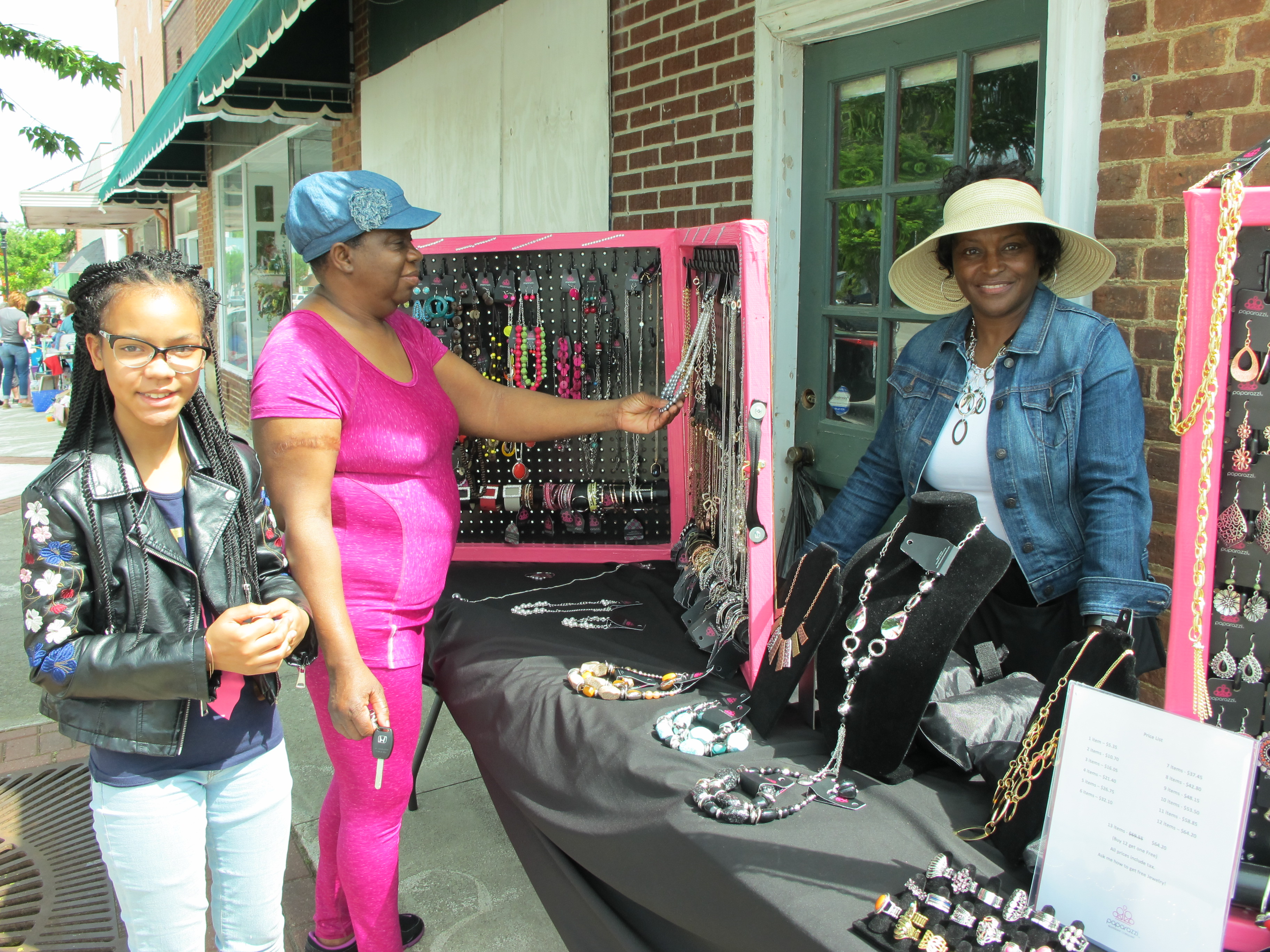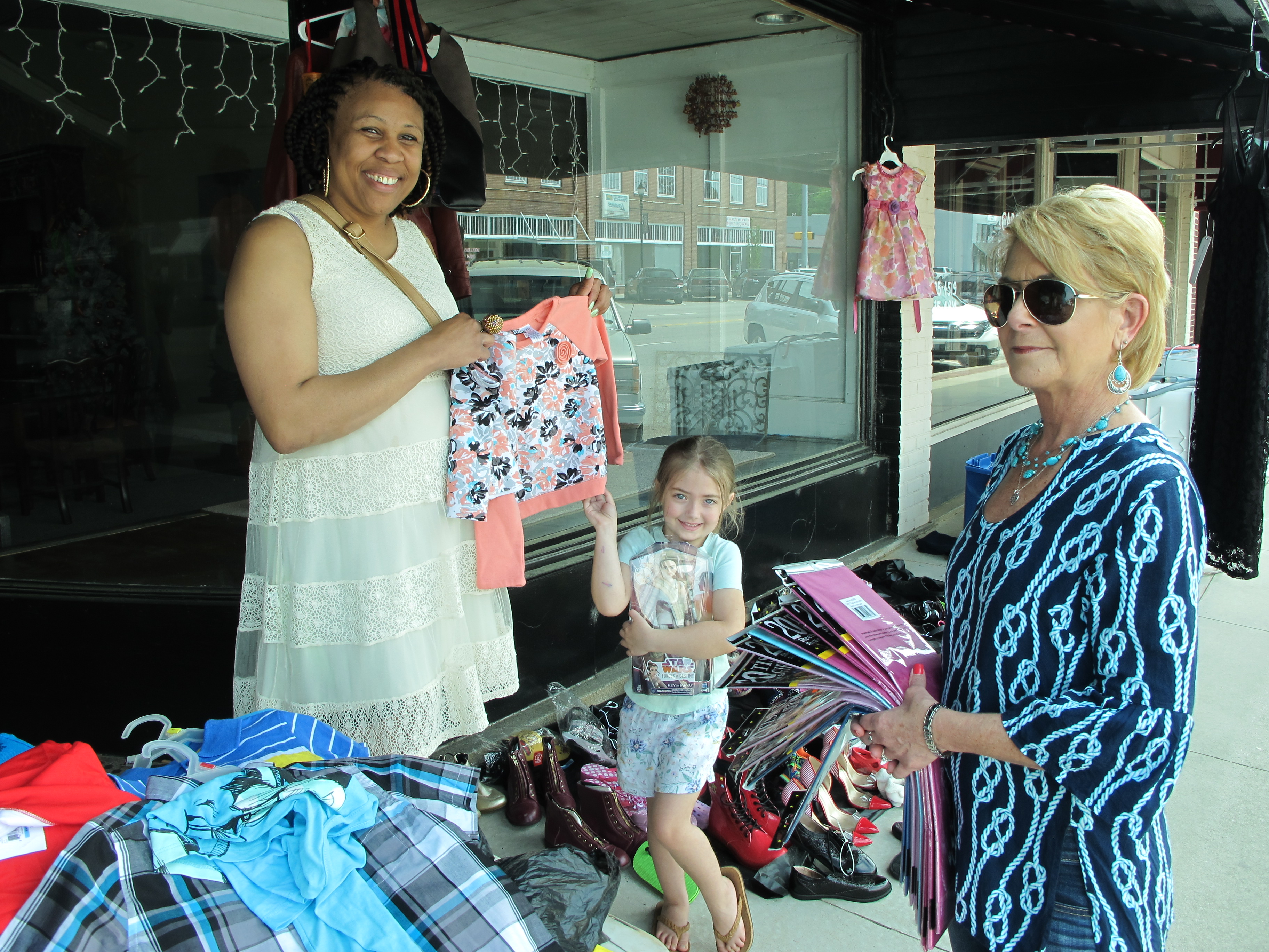 WINNSBORO – It was a bright, sunny day for a sidewalk sale in downtown Winnsboro on Saturday. The annual Winnsboro Merchants’ Sidewalk sale was a big success with about 20 vendors lining the shady side of Congress Street and a few on the sunny side. Shoppers picked through clothing, jewelry, accessories, memorabilia, furniture, games, lamps, dinnerware, you name it.  The Cornwallis Tea room, the Winnsboro House of BBQ and The Barn Express had brisk business until well after the lunch hour, and most of the merchants were open all day.