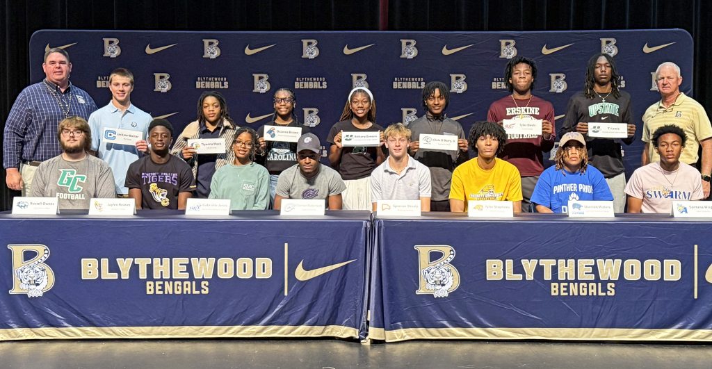 BLYTHEWOOD – Blythewood High School recognized 16 members of the Class of 2025 that have announced their intention to continue their athletic careers on the collegiate level. The school held a ceremony to celebrate this accomplishment with family members and teammates.