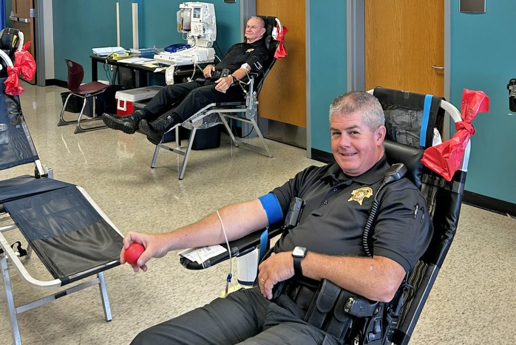 WINNSBORO – Steve McDonald (rear) and Lawrence Hodge donated blood during the Sheriff’s Blood Drive on May 15 at Fairfield Career & Technology Center.