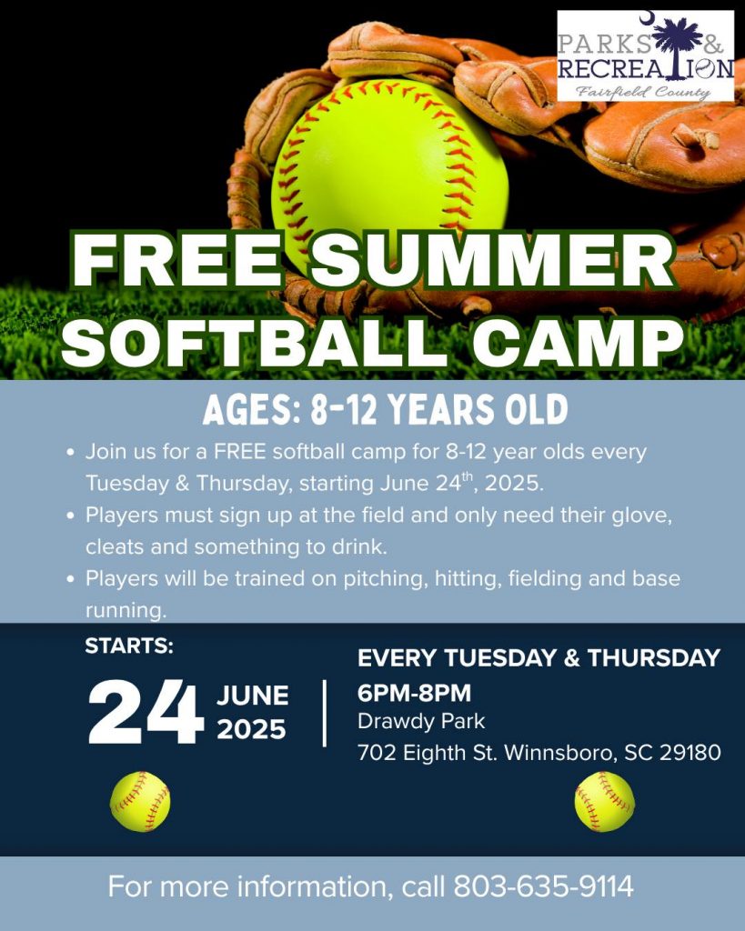 WINNSBORO – Fairfield County Recreation is currently hosting free softball camps for 8-12 year olds twice a week at Drawdy Park in Winnsboro.