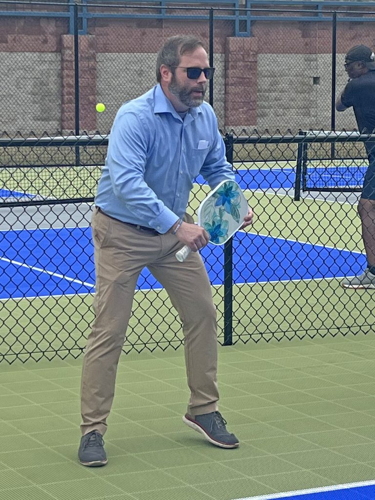 “The colorful blue and green soft mat that covers the courts is porous so that rain doesn’t pool or make the concrete base slippery,” Sowell said. “These are tournament rated courts. It’s very nice. Up to 24 people can play on the six courts at a time. There’s a player bench outside the fence and we’re looking at adding paddle holders.”