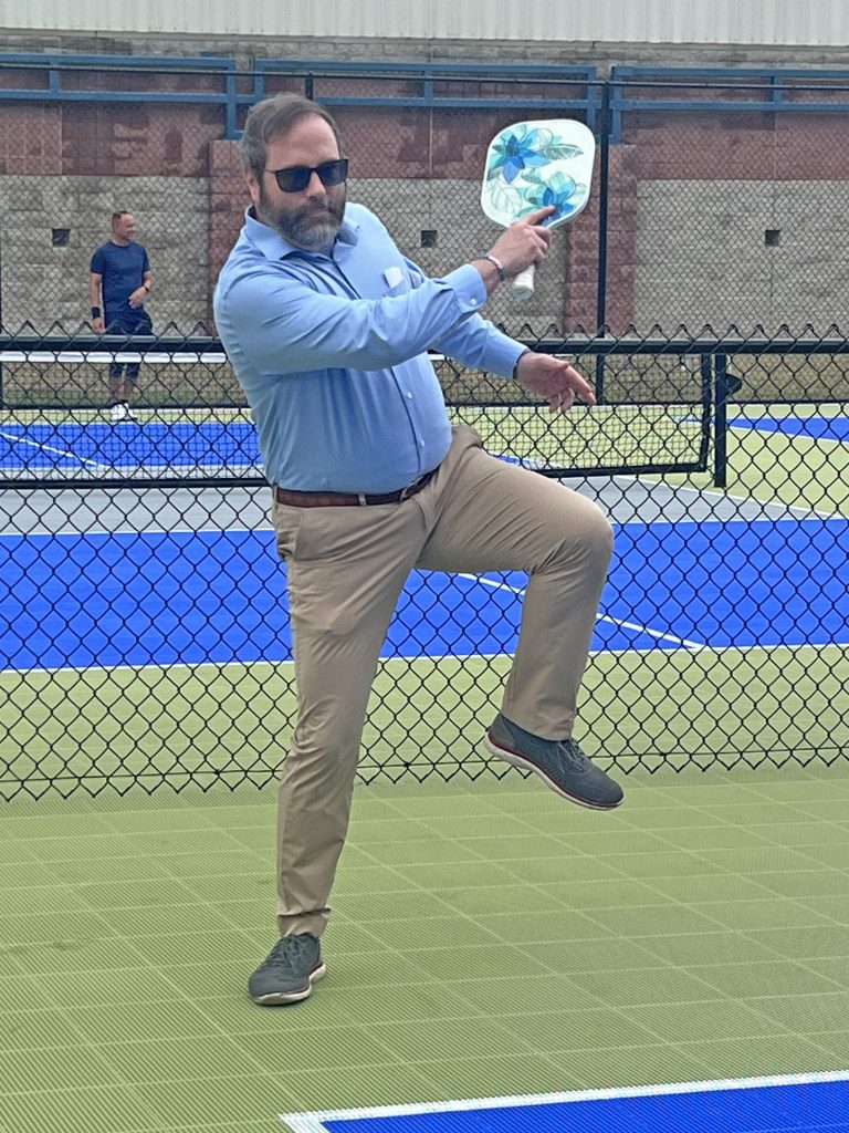 Lewis and Pugh shared the ribbon cutting honors and, after a photo op of all the officials, games began in earnest. All six courts were quickly filled with a total of 24 enthusiastic players, including some of the local elected officials.
