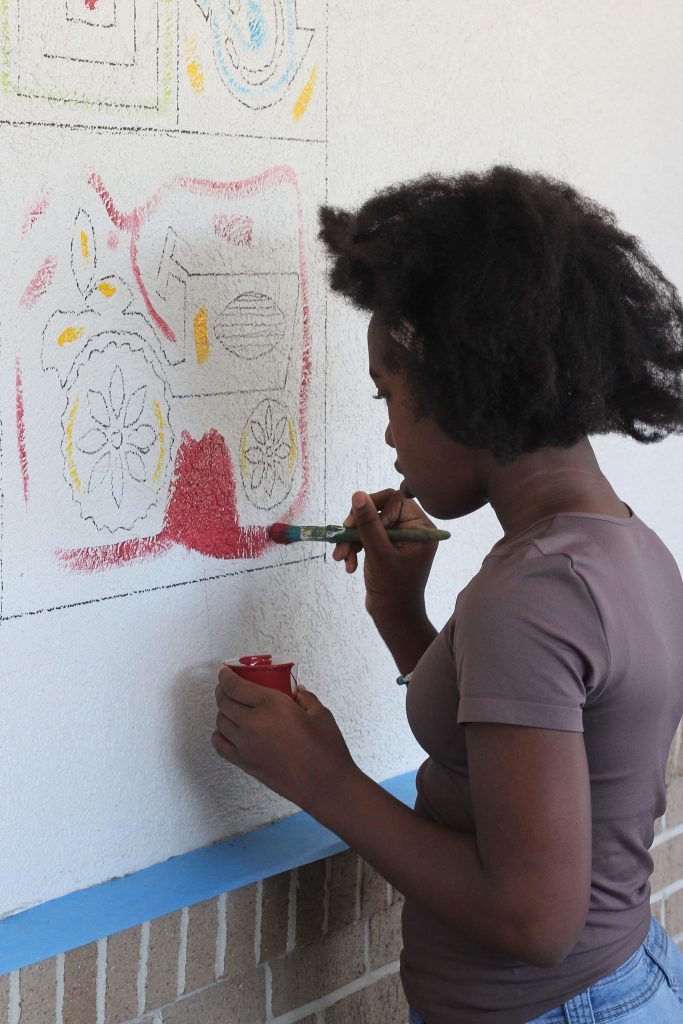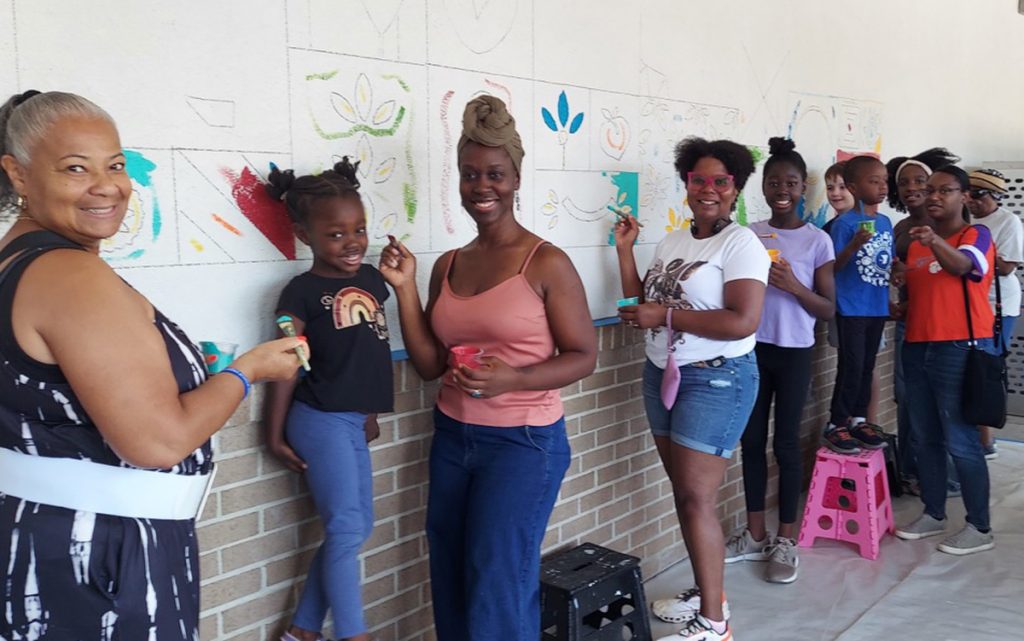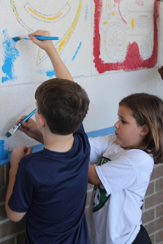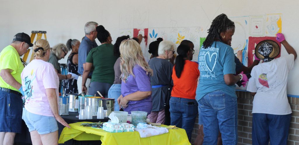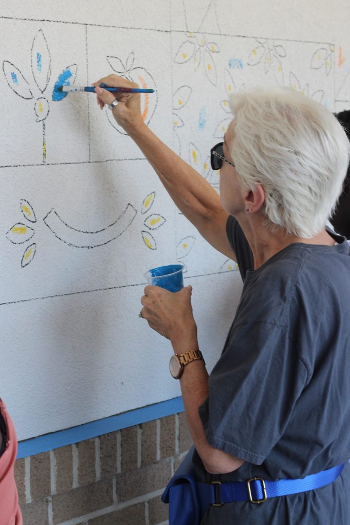 The store management provided the paint, brushes and refreshments, and those in attendance filled in the lines of the mural that had been pre-drawn by mural painter Crystal Frye with EZ Easel.