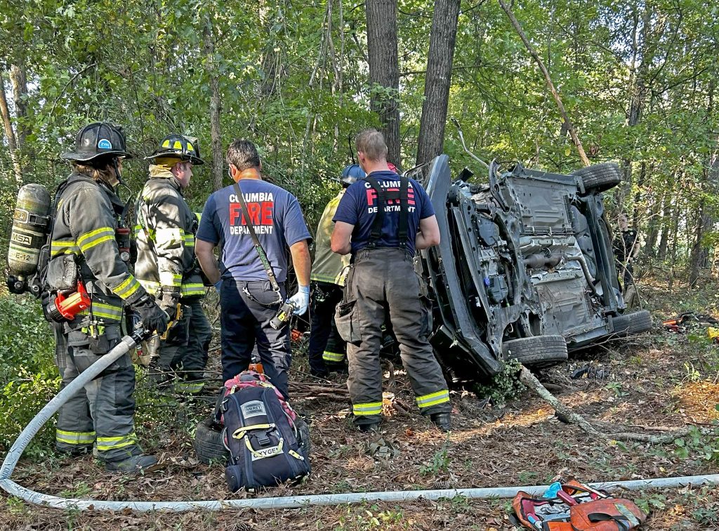 BLYTHEWOOD – Around 8:30 Saturday morning, Sept. 20, an SUV traveling south on Hwy 321 near the intersection of Friendly Circle, crossed left over Hwy 321, and traveled about 900 yards through a pasture, a large front yard and driveway, into an adjacent woods, crashing into a tree and turning over.