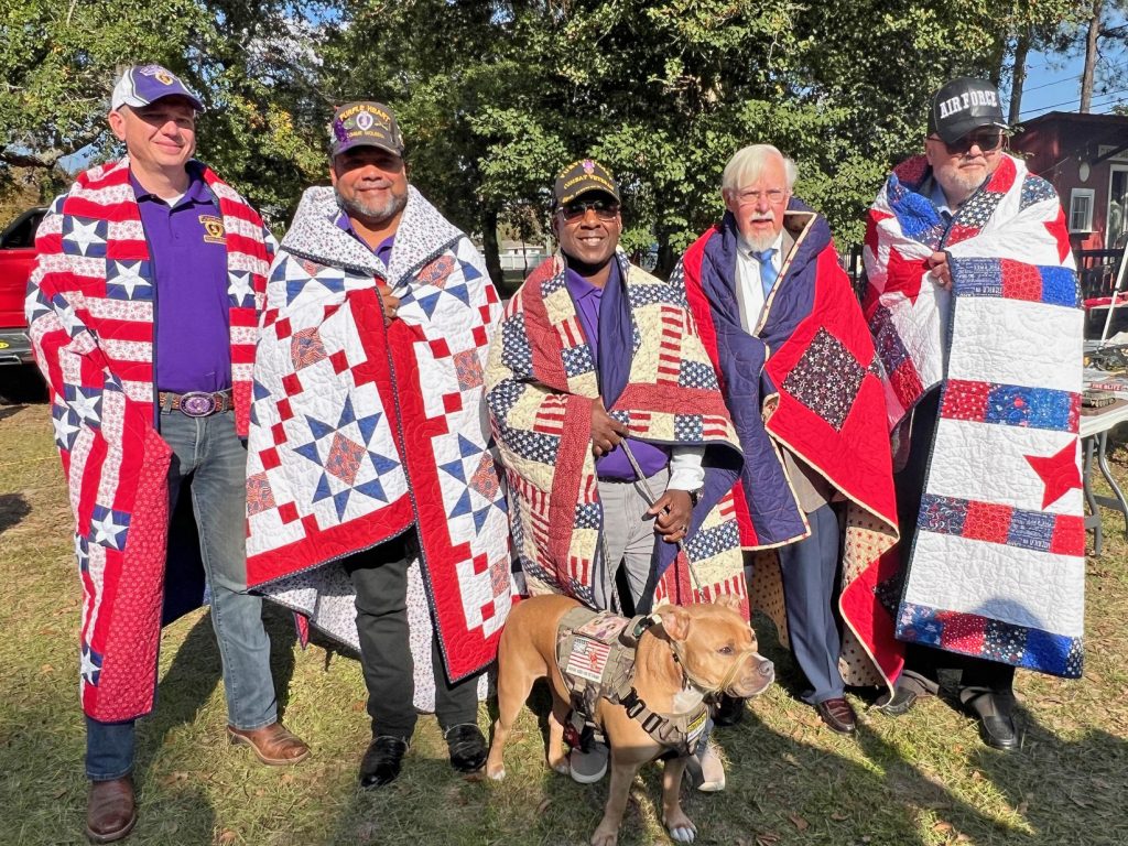“We purchase and provide the finest fabrics to make these quilts,” Hurlbert said. “Our mission is to cover service members and veterans, who have been touched by war, with comforting and healing quilts of valor. We are so grateful to you,” Hurlbert said to the veterans.