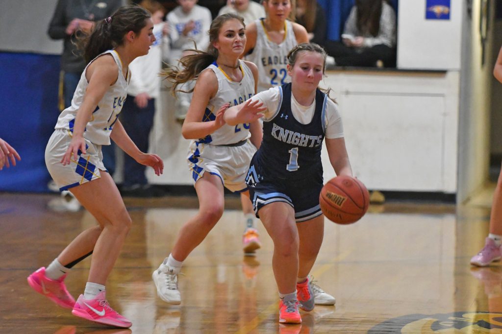 Eagle guards Kate Baker, left, and Mary Margaret Swearingen swarm a King Academy defender in last week’s win. Richard Winn claimed a 54-41 win over King. | Laura Bonds