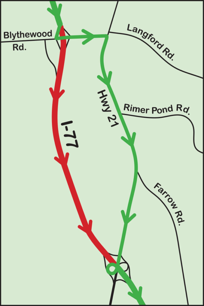 According to the project map, motorists will then travel east on Blythewood Road, turn onto Langford Road, and head south on Highway 21 (Wilson Blvd).Drivers can re-enter I-77 southbound at the next available interchange.
