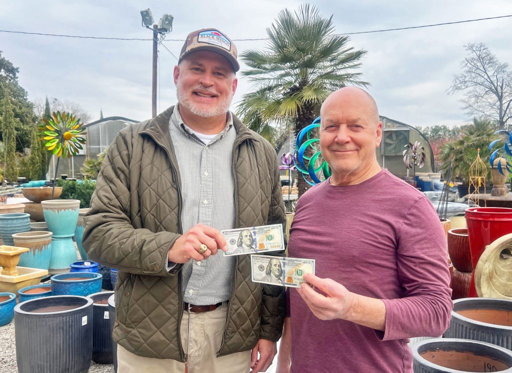 On Tuesday, Britt stopped by Reese’s Plants where owner Philip Reese presented him with two $100 dollar bills. Asked how he planned to spend his winnings, Britt glanced around at the hundreds of plants, trees, ceramic pots, and other landscape offerings.