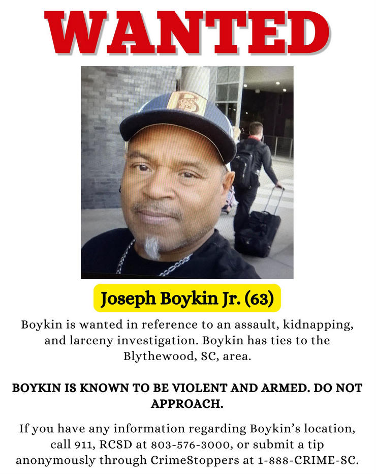 RICHLAND COUNTY – Richland County Sheriff’s Department is seeking the public’s help in locating 63-year-old Joseph Boykin Jr., a man wanted in connection with a violent investigation involving kidnapping, assault, and larceny.