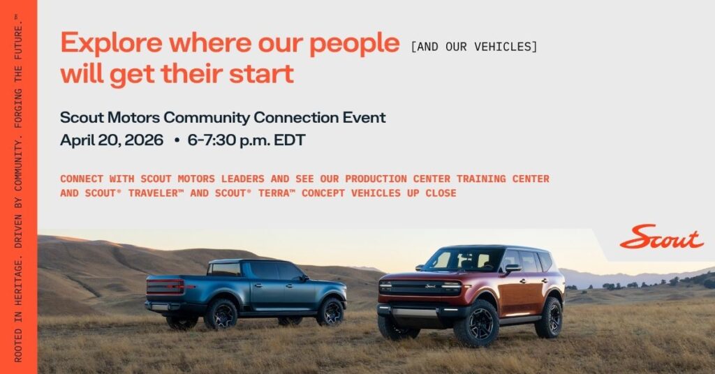 The event, held at the company’s Production Center Training Center, offers residents a rare opportunity to connect directly with Scout Motors leaders. Attendees will also get an up-close look at the highly anticipated Scout Traveler and Scout Terra concept vehicles.