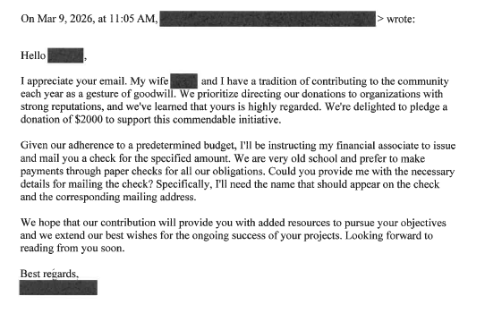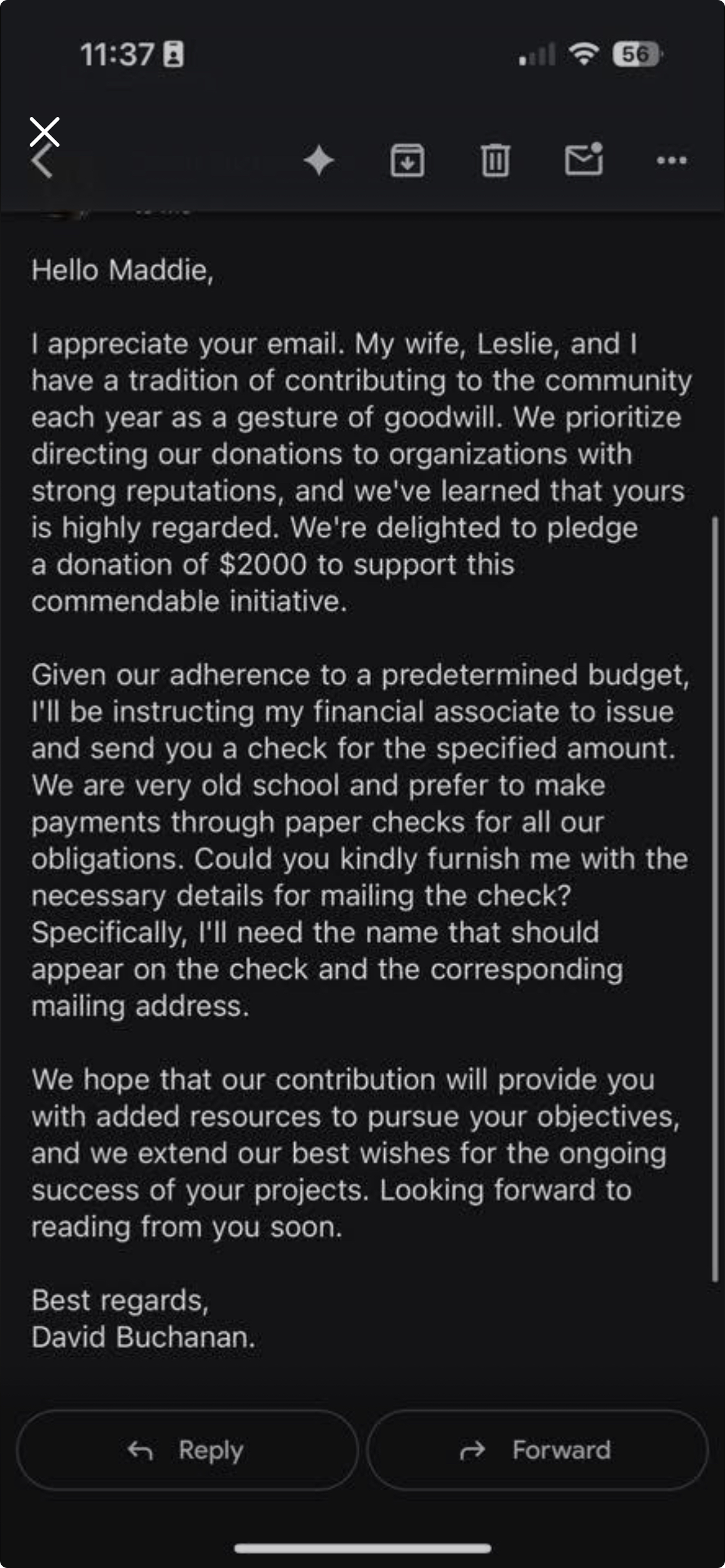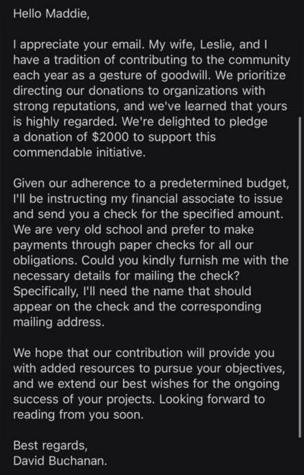 According to dozens of social media posts and comments, a person named David Buchanan emails a letter to animal welfare non-profits from coast to coast, expressing interest in making a generous donation, typically around $2,000. He then sends a fake check for a higher amount, usually $4,000, and pressures the non-profit to return the difference. If they do, they lose the $2,000 and the $4,000 check bounces.