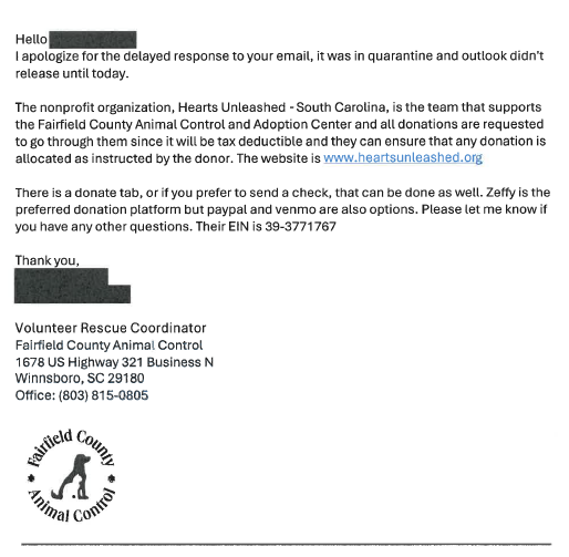 WINNSBORO – The S.C. State Law Enforcement Division (SLED) is investigating a former Fairfield County animal shelter volunteer for fraud, but the primary evidence released by the county appears to be a widely documented internet scam.