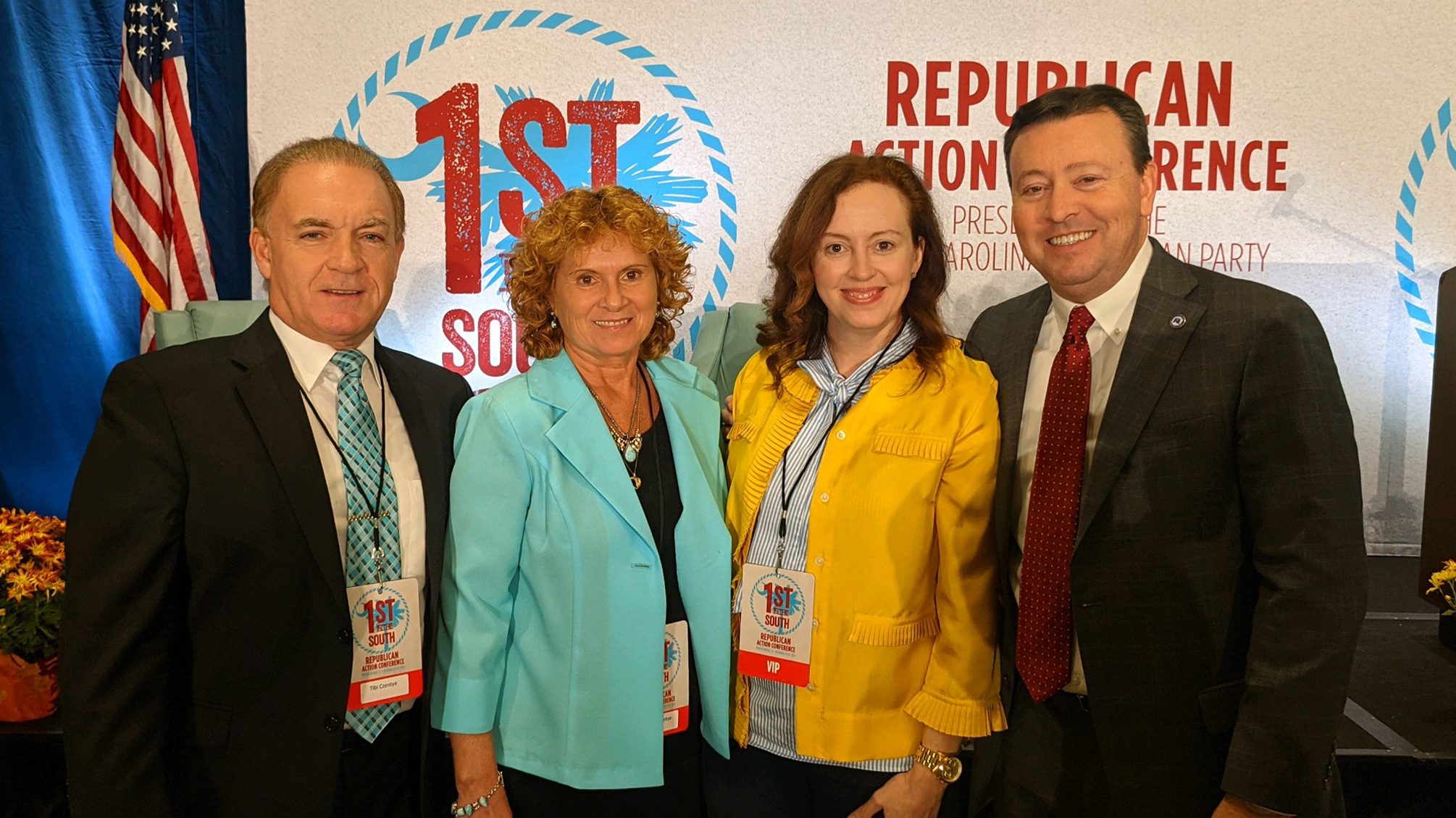 MYRTLE BEACH – Tibi and Sandra Czentye, of Lake Wateree, and members of the Fairfield County GOP, visit with Drew McKissik, SC Chairman of Republican...