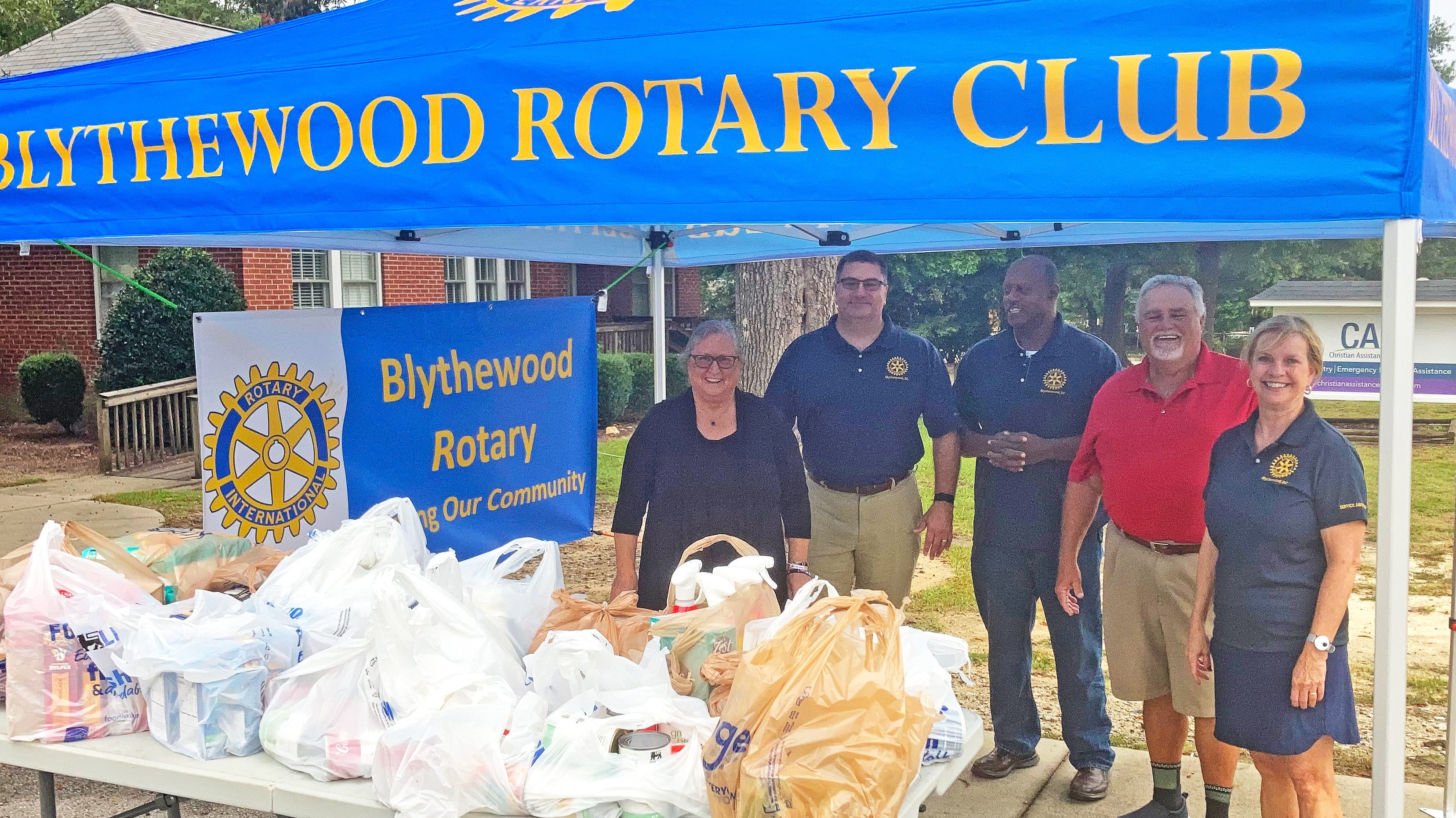 BLYTHEWOOD – Collecting donations and funds valued at $1,000 for the Christian Assistance Bridge are Blythewood Rotarians Lyn Mueller (Center for Achievement), Jimmy Martin (Rotary...