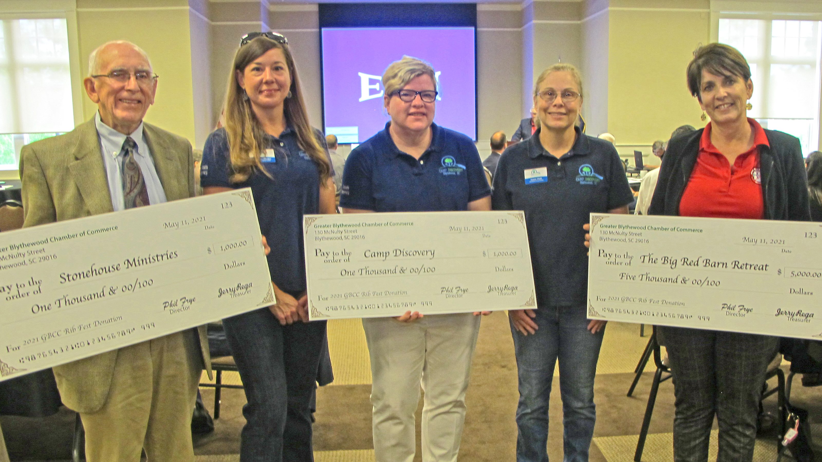 BLYTHEWOOD – The Blythewood Chamber presented donations from the recent Doko Rib Fest to these charities: Stone House Ministries (Rev. Don Hillyard), Camp Discovery (Heather...