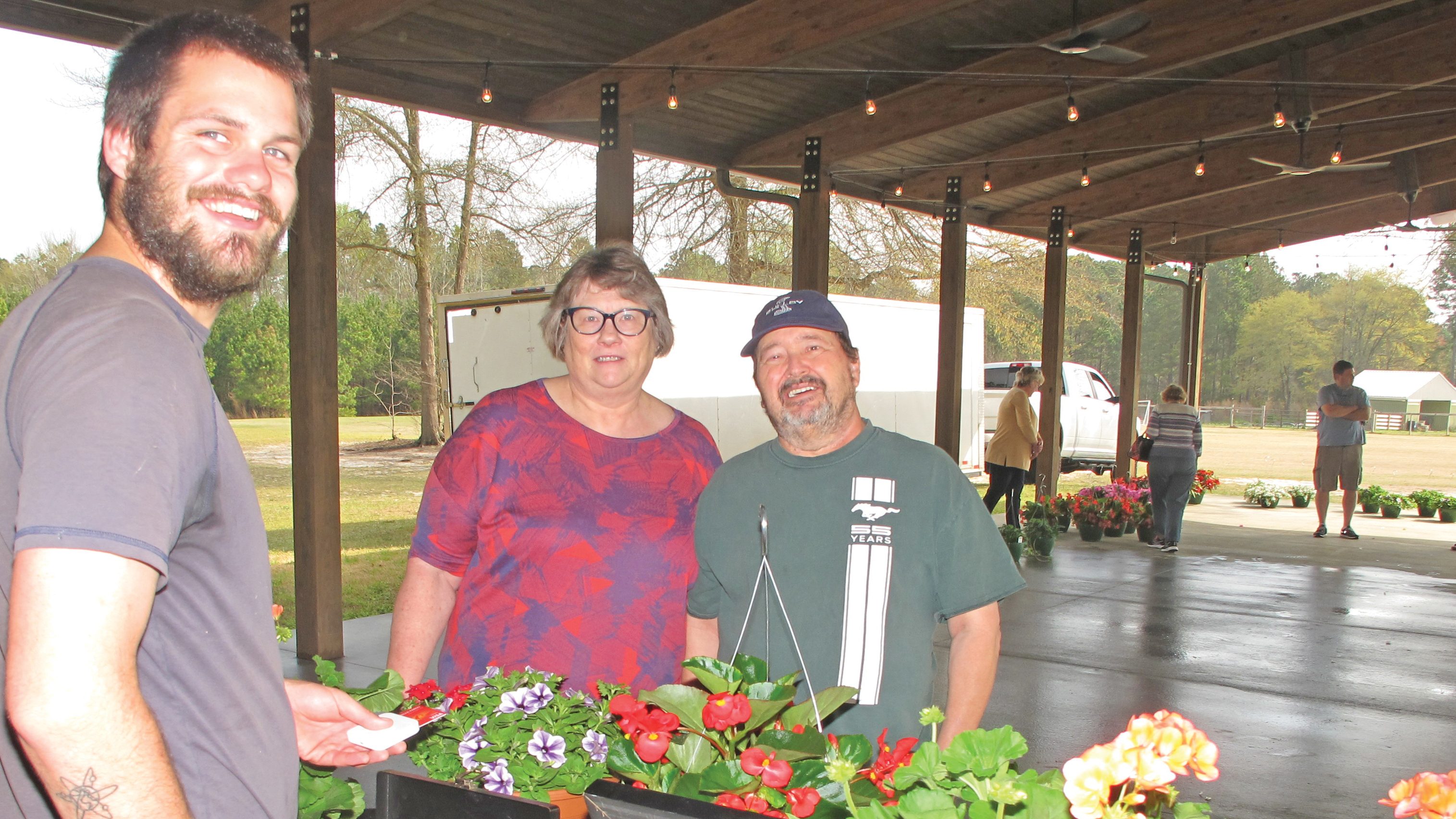 BLYTHEWOOD – Rigsby Sanders, left, rings up another sale as Carol and Steve Thompson purchase hanging flower baskets at the Blythewood Presbyterian Church’s annual Spring...