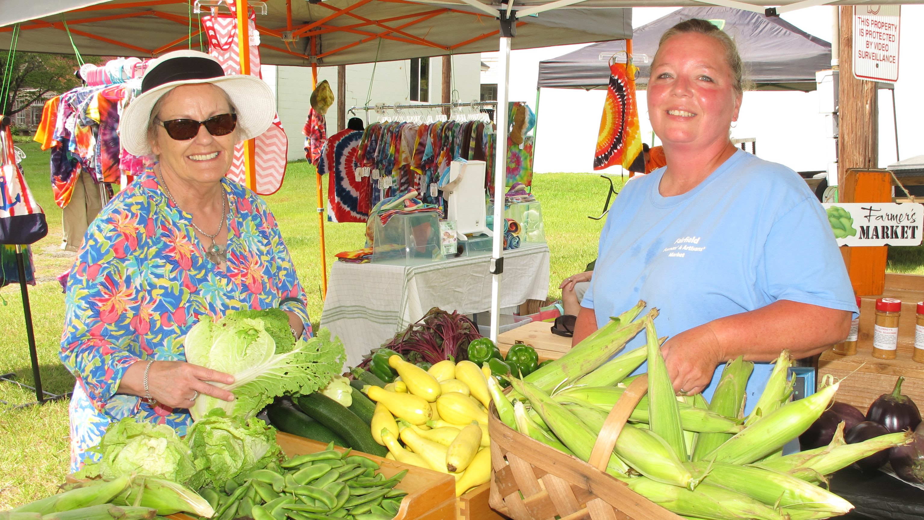 RIDGEWAY – The Fairfield Farmers & Artisans Market co-manager Valerie Clowney, right, welcomes customer Jon G. Ward to the market’s satellite location in Ridgeway. Eleven...