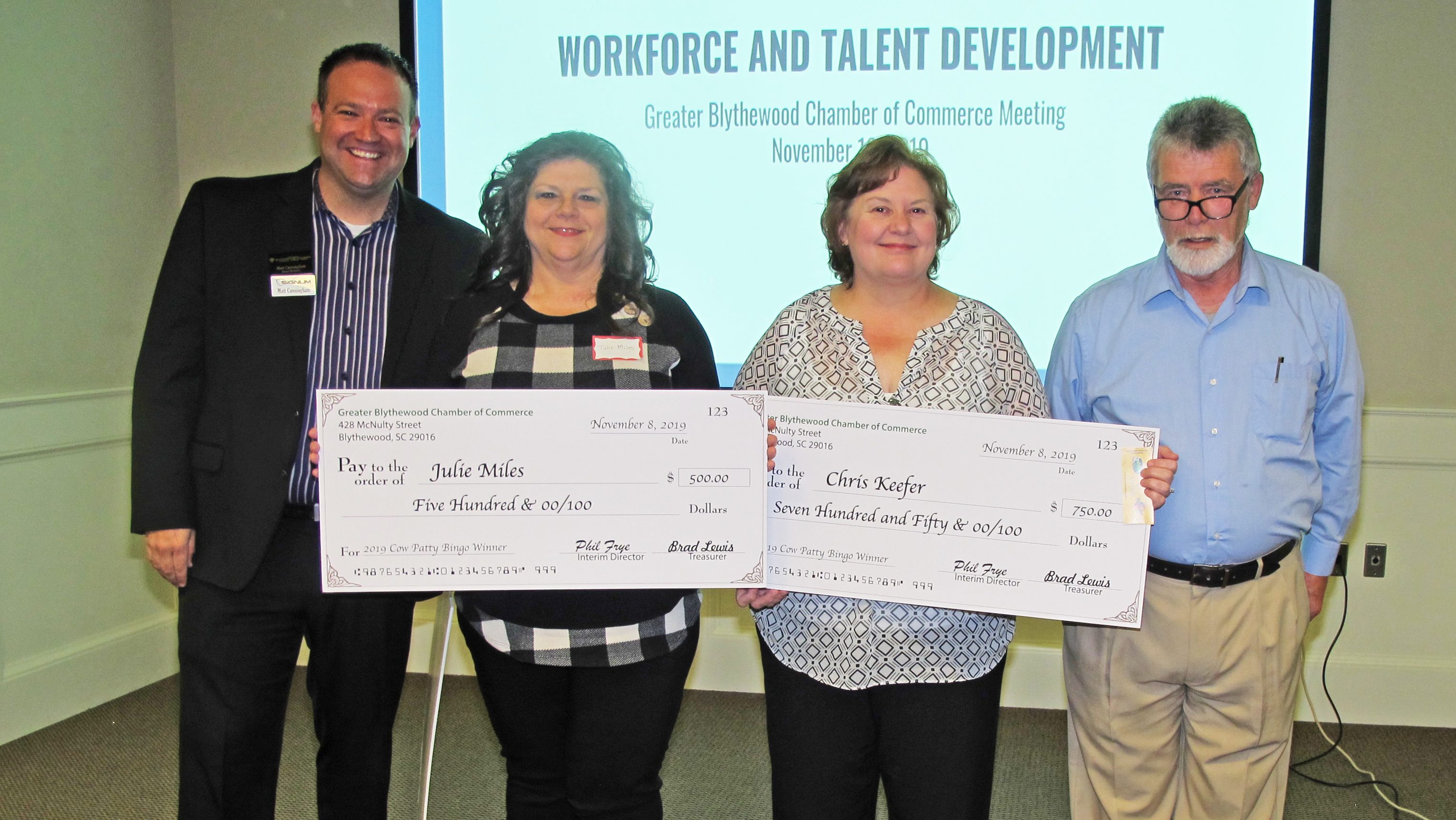 BLYTHEWOOD – Winners in the Blythewood Chamber of Commerce’s Oktoberfest Cow Patty Bingo were announced Tuesday morning at the Chamber’s monthly meeting. From left, President...
