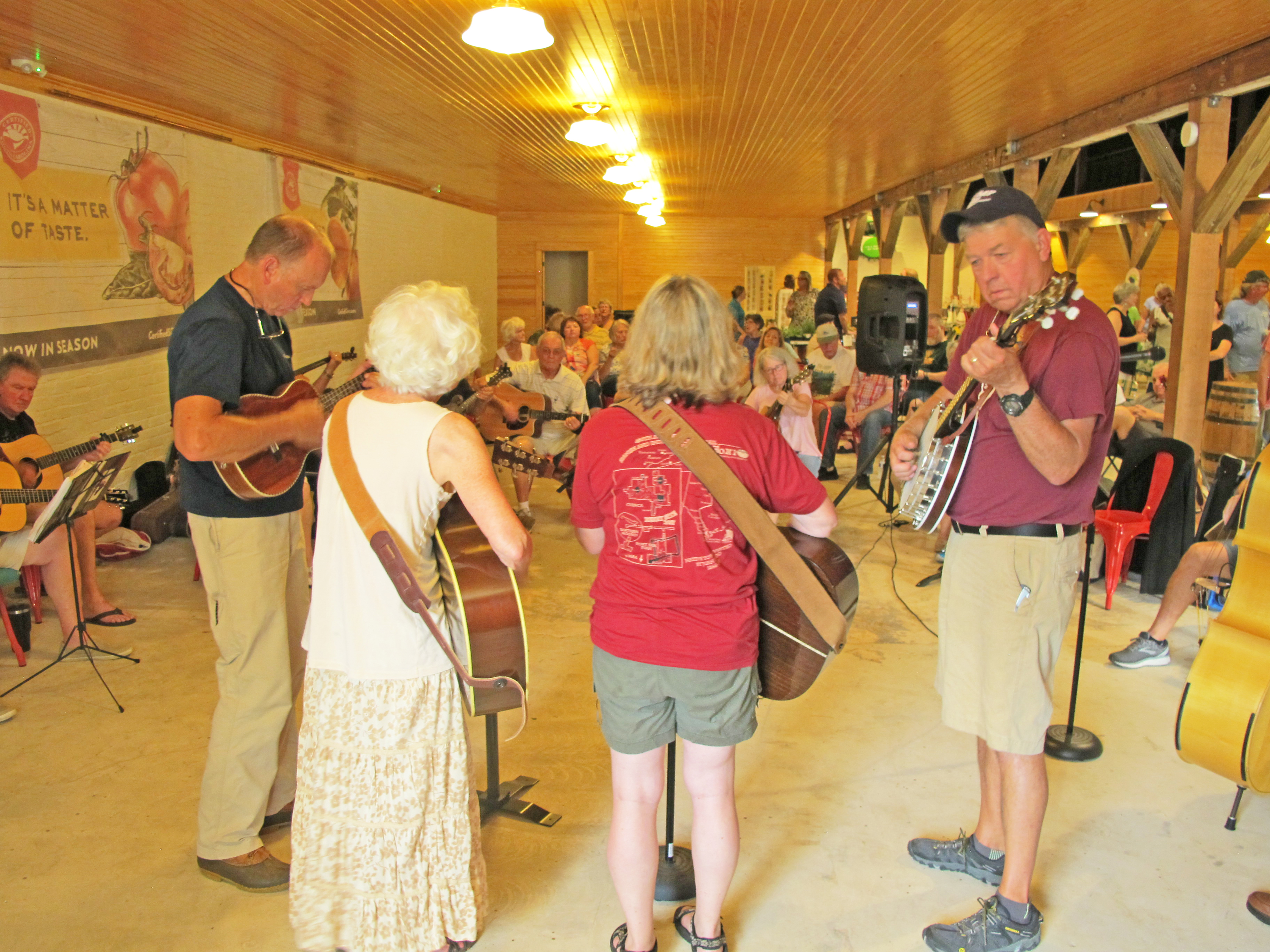 WINNSBORO – Jeff Mattox, Lynn Douglass, Natalie Pope and Heyward Mattox pick and grin during the Fairfield County Farmers’ and Artisans’ inaugural Bluegrass and Traditional...
