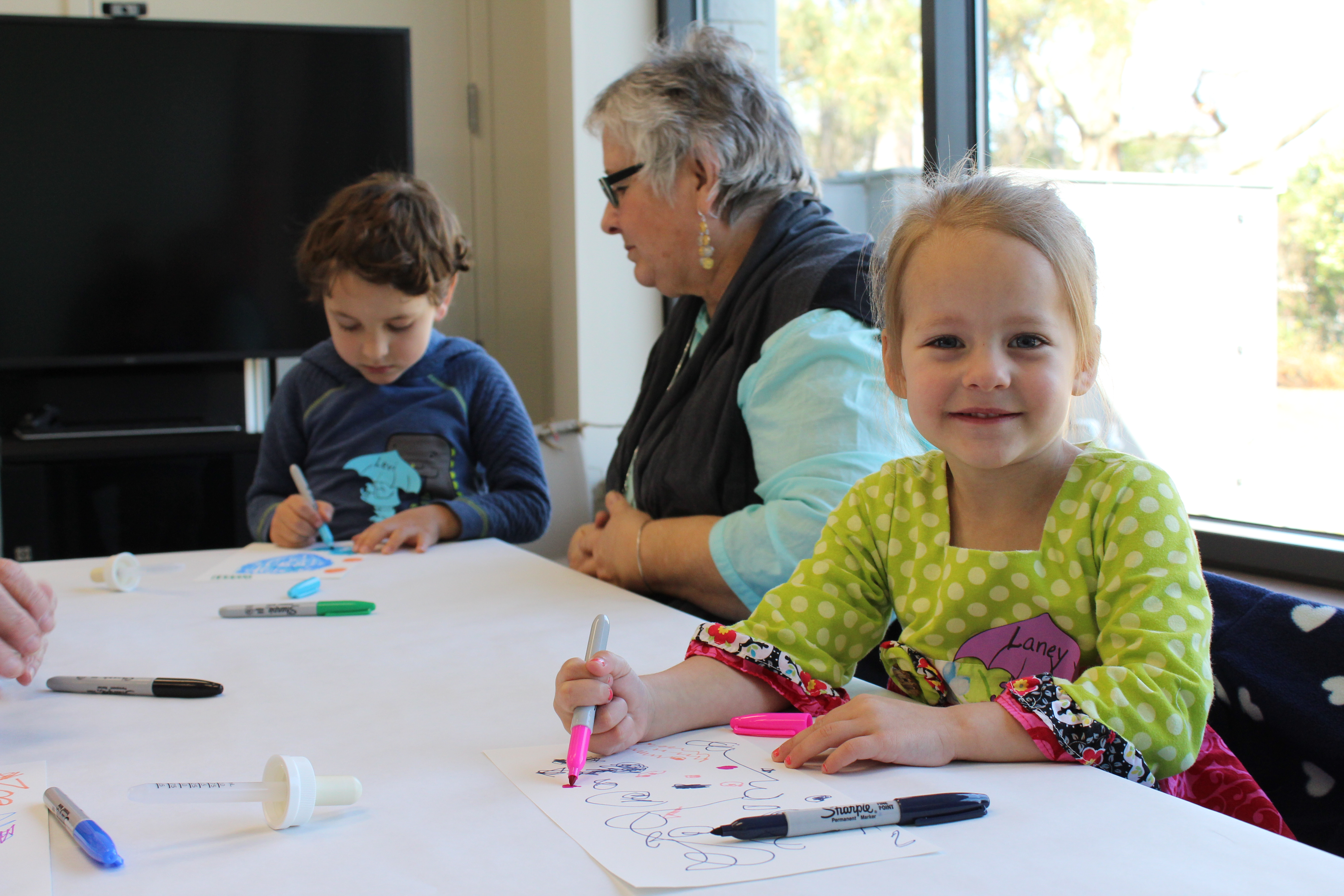 BLYTHEWOOD – Laney Latham, 3, and Levi Moore, 5, with his grandmother, color the outside of rain sticks they created Tuesday at the Blythewood Library’s...