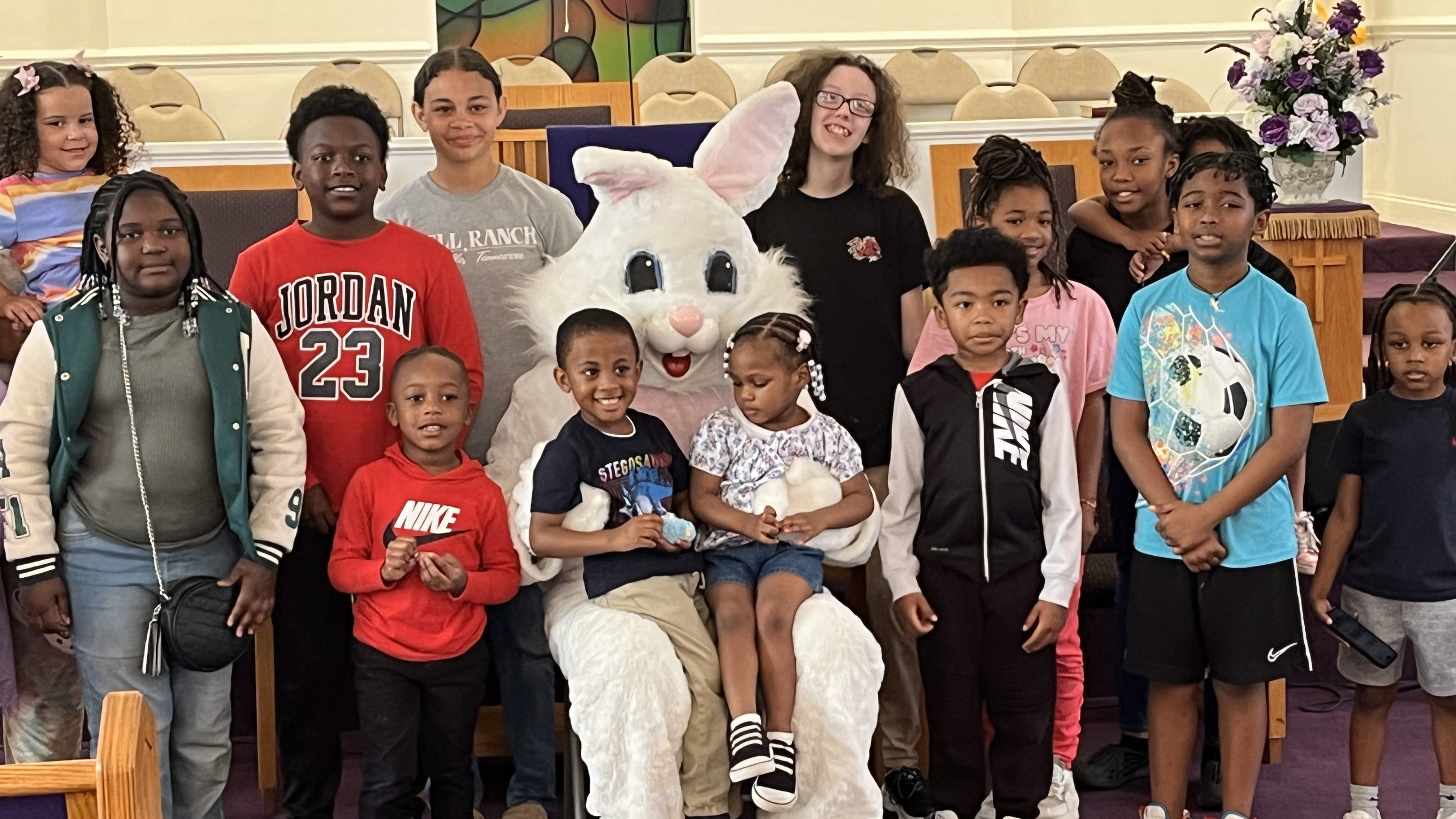 BLYTHEWOOD – On a bright sunny Saturday, sisters Madison, Aleah, and Emma Dawkins pose for a photo with the Easter Bunny following the Village Church’s...