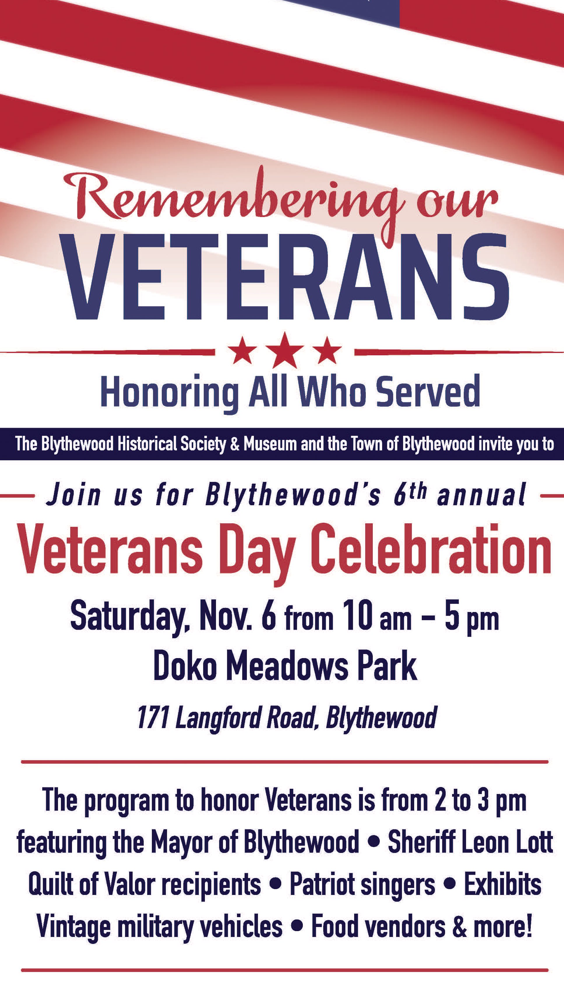 This event has been postponed to Sunday, Nov. 7. BLYTHEWOOD – The Town of Blythewood and Blythewood Historical Society and Museum will honor veterans during...