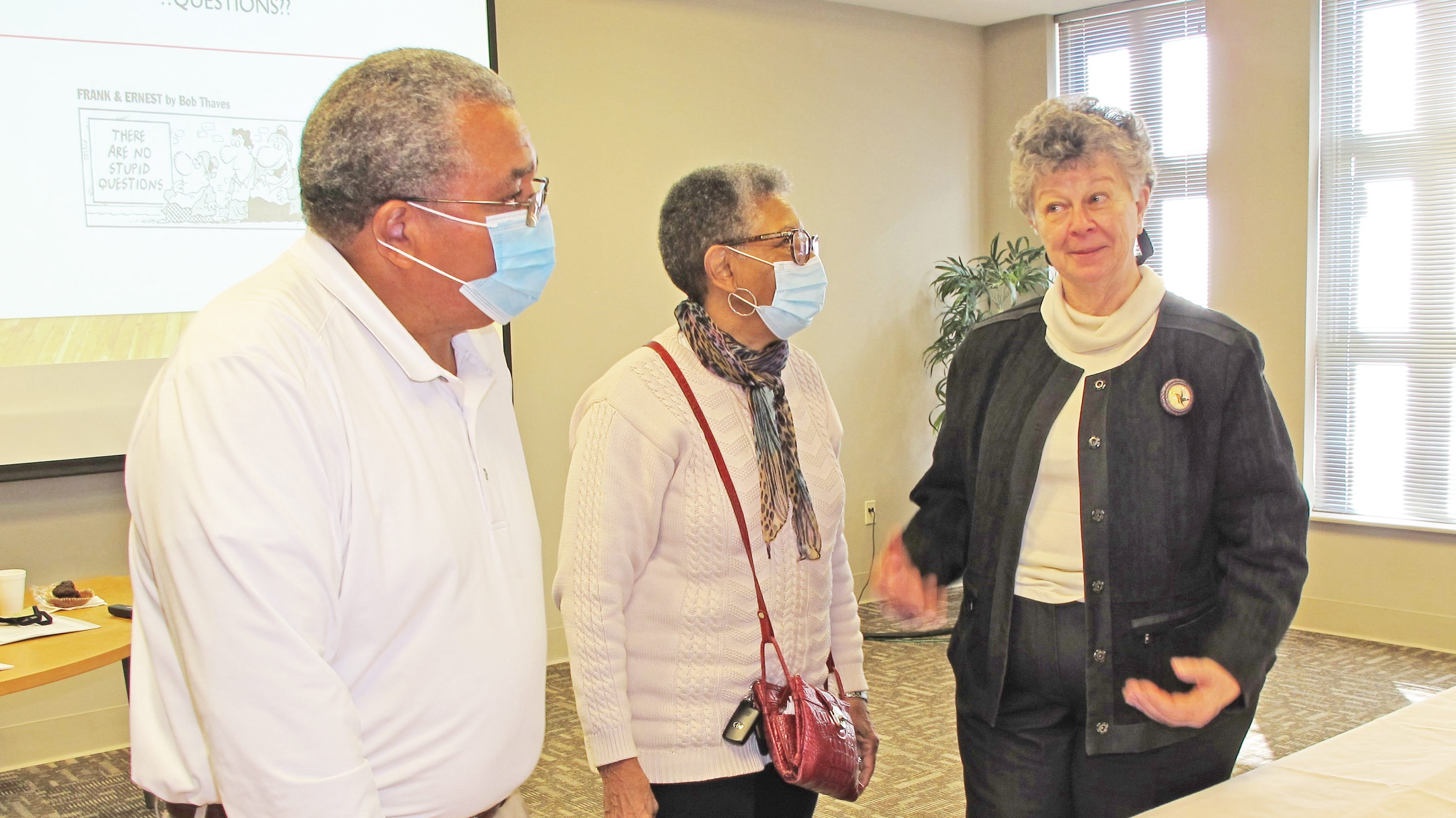 County Council Chair Moses Bell and new council member Shirley Greene chat with Helen McFadden who facilitated an orientation workshop for parliamentary procedure and Robert’s...