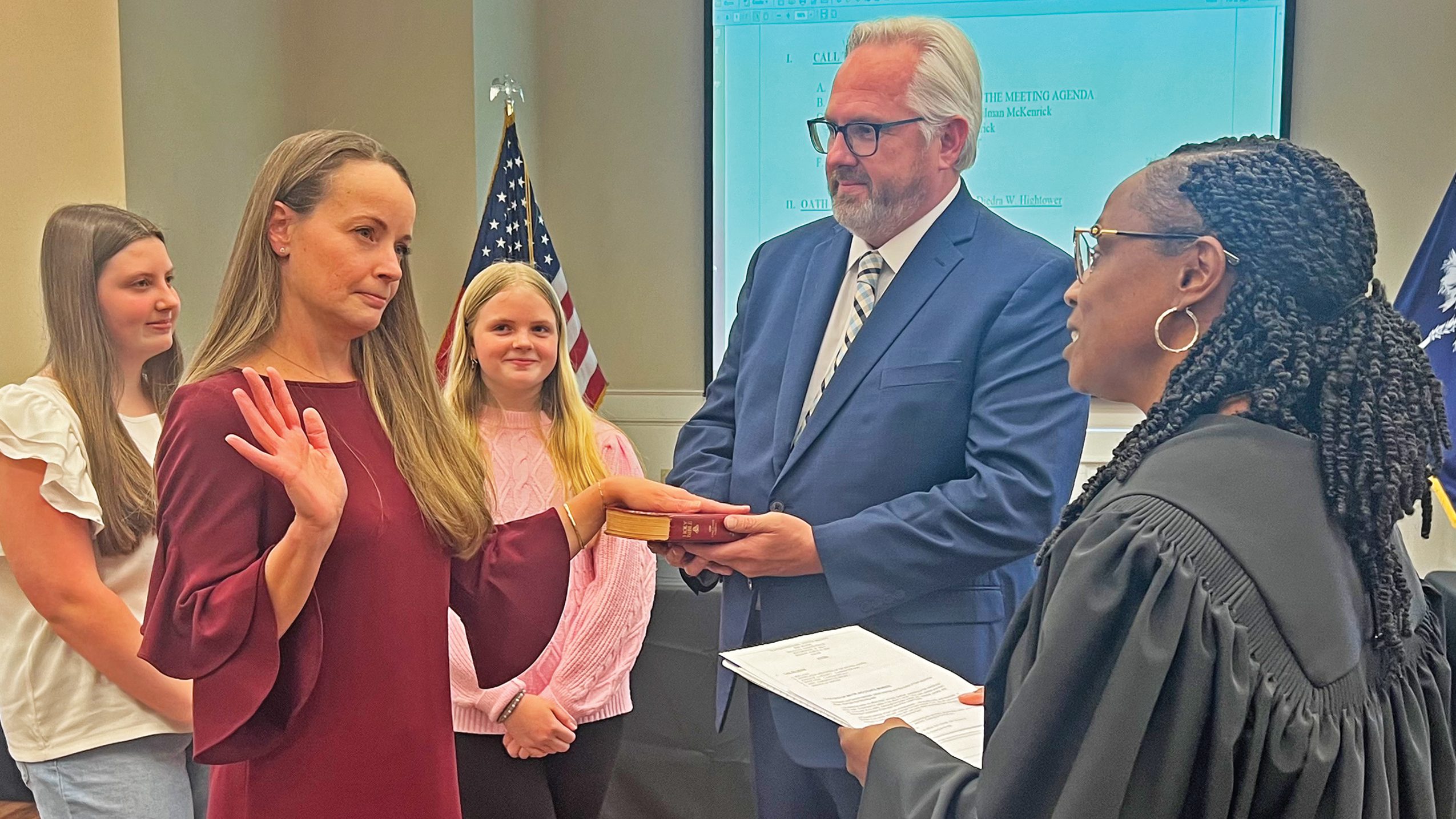 BLYTHEWOOD – Erica Page, the town’s newest town council member, was administered the oath of office by Judge Deirdre Hightower Monday night as her family...