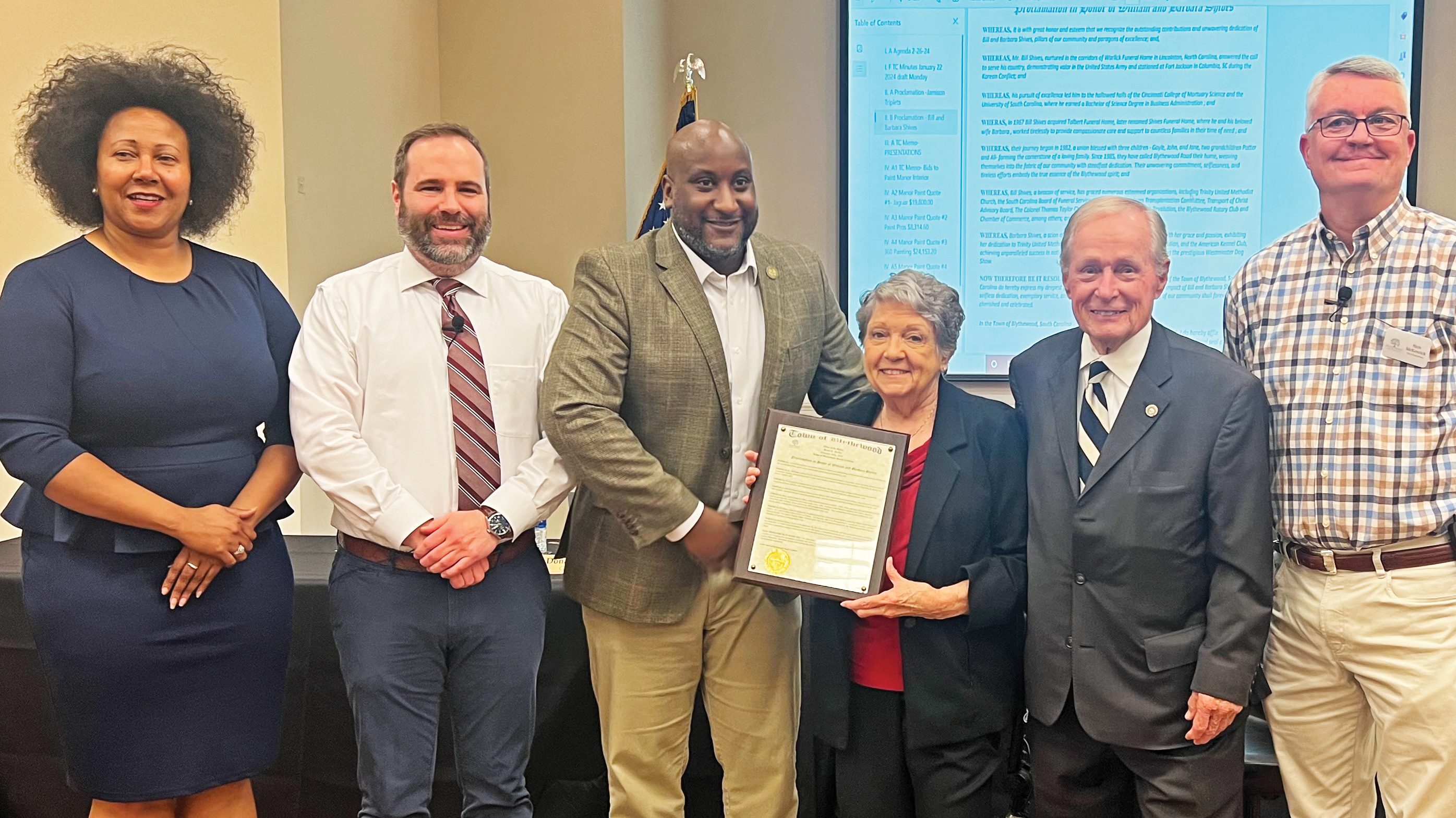 BLYTHEWOOD – Bill and Barbara Shives, center, longtime Blythewood residents and founders of Shives Funeral Home and Bibi’s Kennels, were recognized at the Monday night...