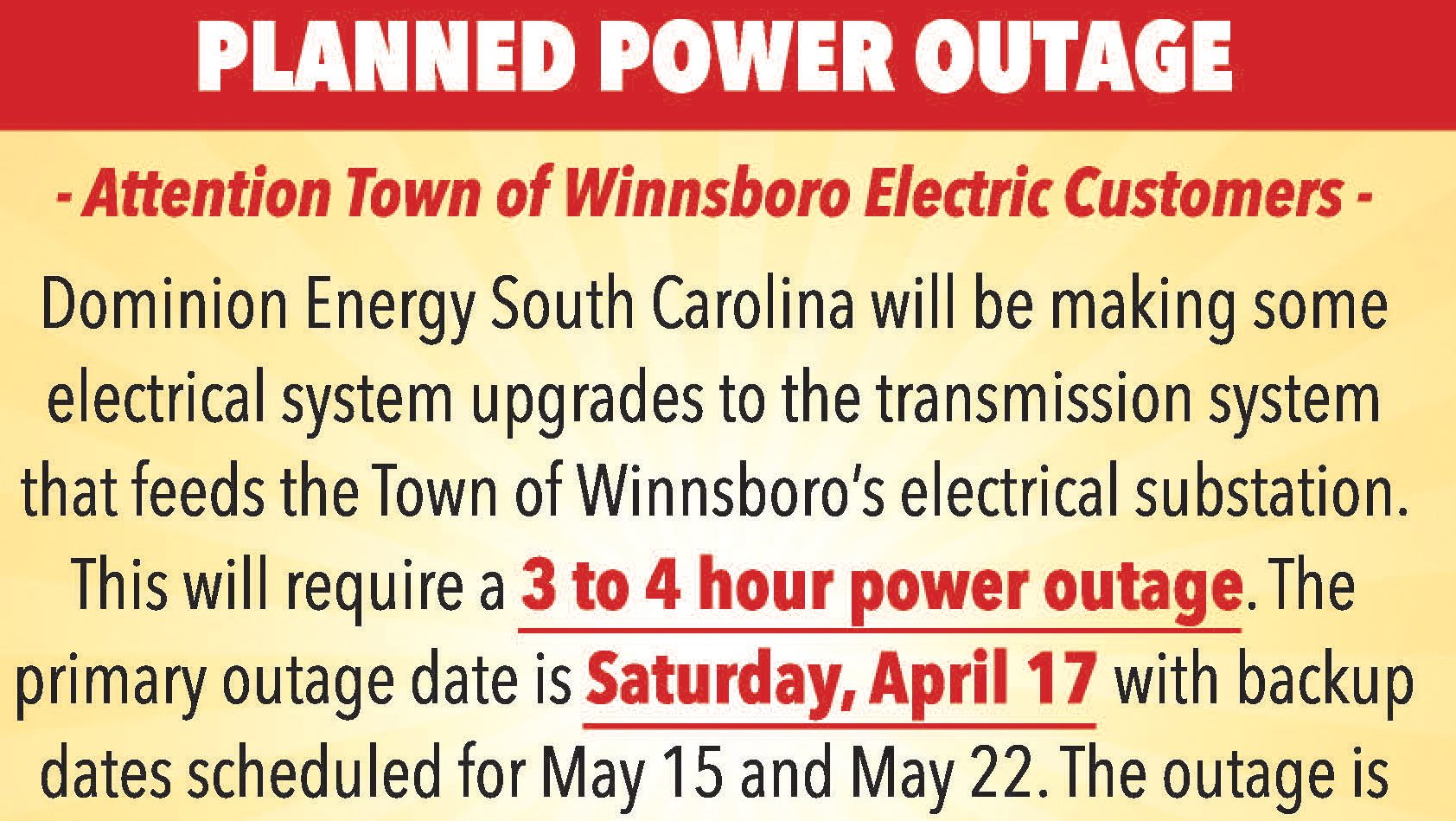 WINNSBORO – Dominion Energy South Carolina will be making some electrical system upgrades to the transmission system that feeds the Town of Winnsboro’s electrical substation....