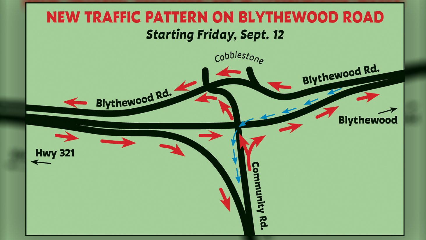 BLYTHEWOOD – The traffic pattern on Blythewood Road will change starting the morning of Friday, Sept. 12. According to Assistant Program Manager for SCDOT Brooks...