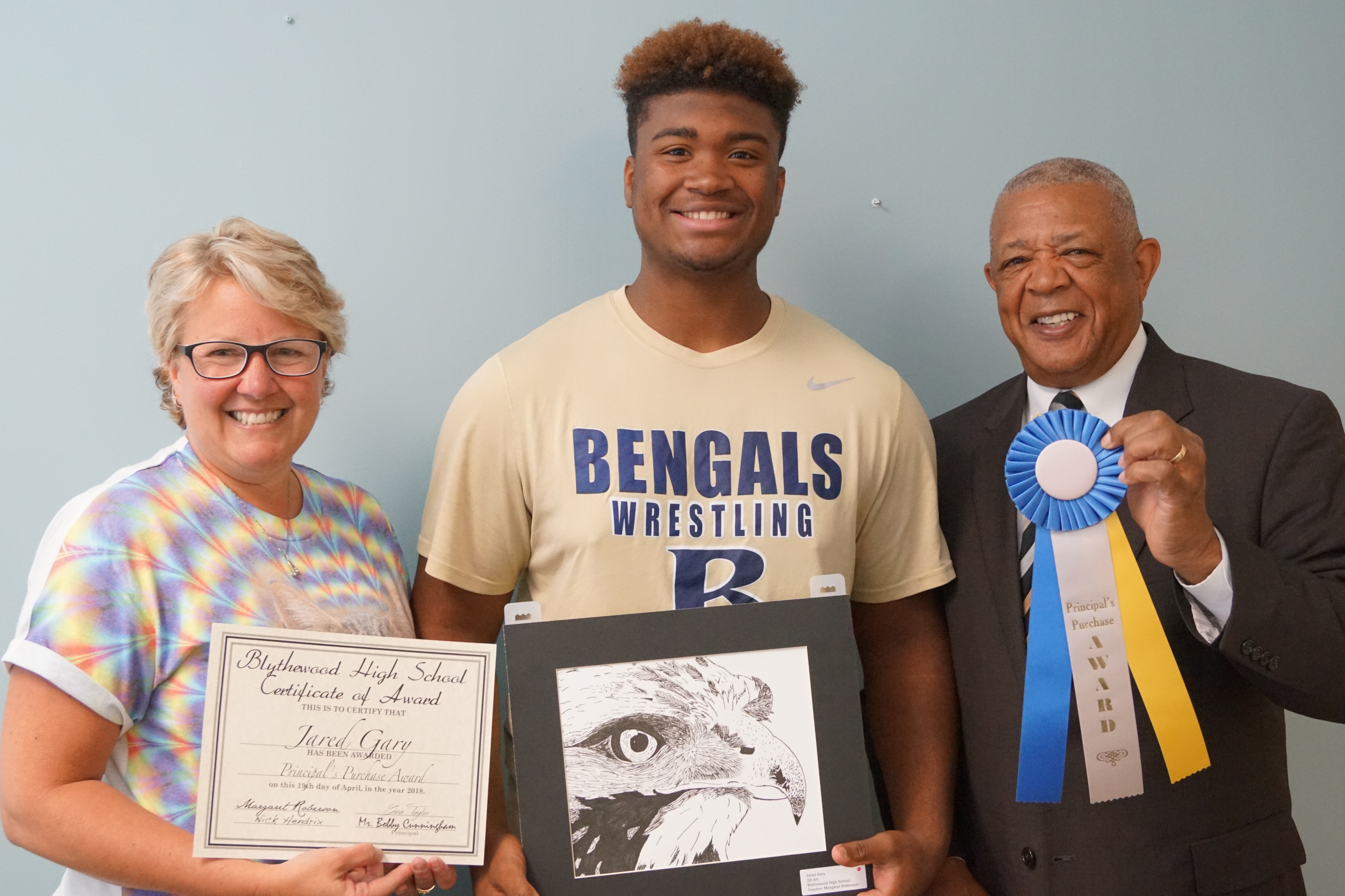 BLYTHEWOOD – Blythewood High School junior Jared Gary has been recognized as the Principal’s Purchase award winner for his pen and ink drawing. Gary, center,...