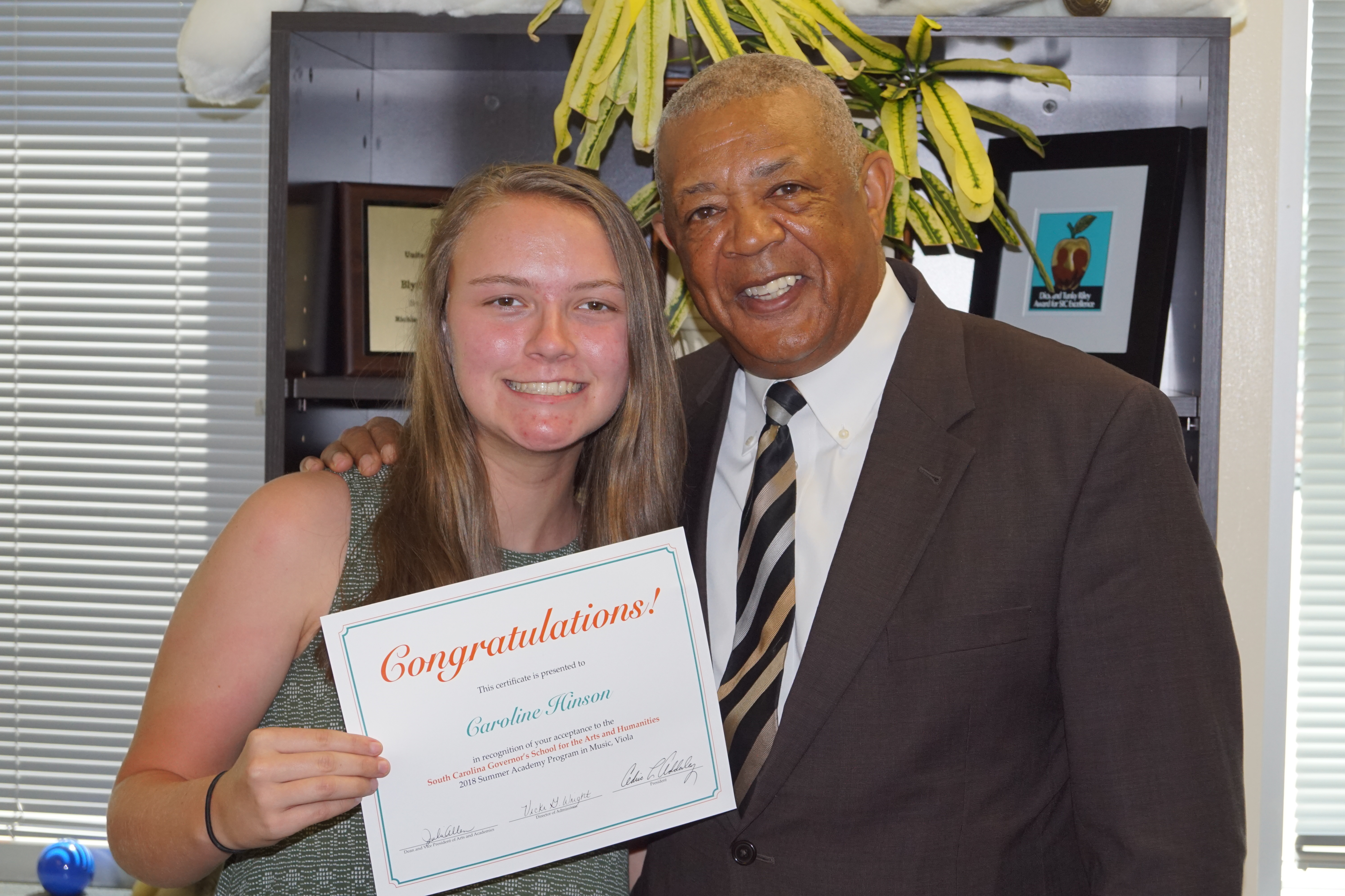 BLYTHEWOOD – Blythewood High School freshman Caroline Hinson, left, pictured with BHS Principal Bobby Cunningham, will participate in the Governor’s School for Arts and Humanities...