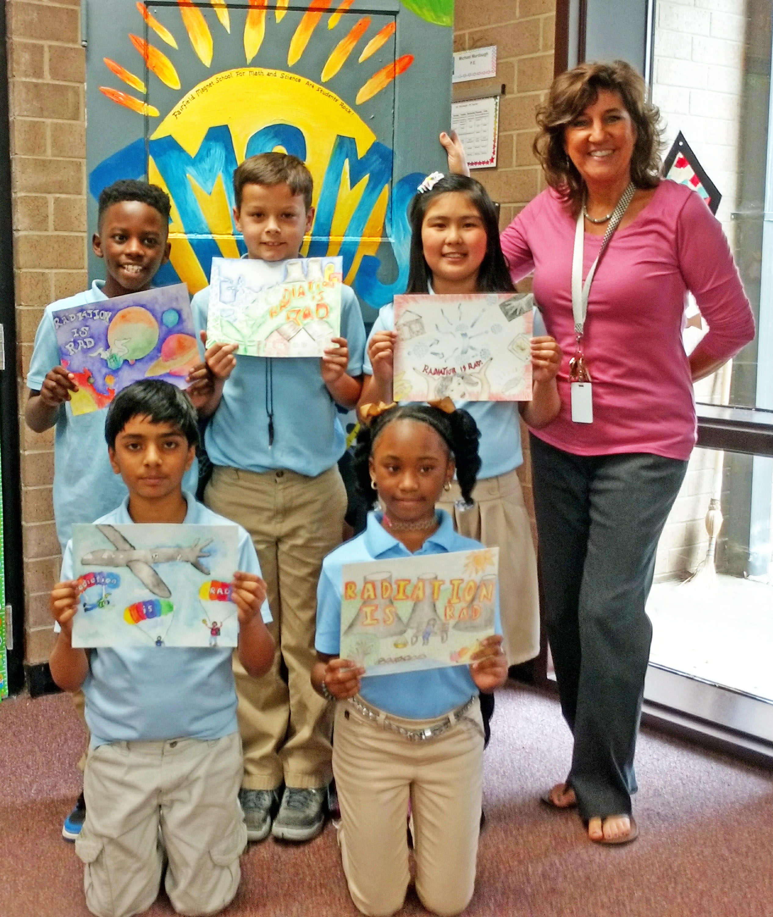 WINNSBORO – Kingston Belton, back left, Owen Wilson, Zielaika Curabo, Krishi Patel, Aaliyah Mayfield. Pictured with their teacher, Kimi Daly, from Fairfield Magnet School for...