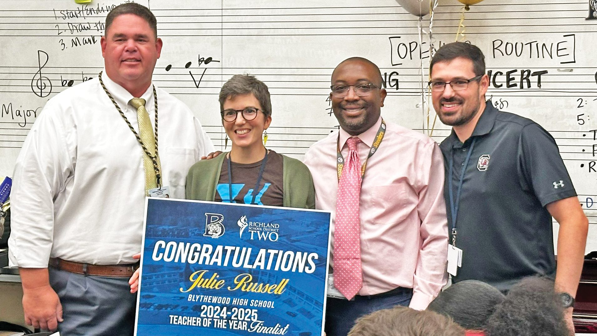 BLYTHEWOOD – Blythewood High School Orchestra Director Julie Russell, center with sign, is one of five finalists for Richland District Two’s Teacher of the Year...