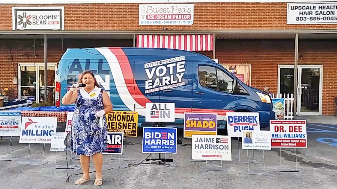 Blythewood resident Rhonda Meisner, a candidate for the Richland Two school board, speaks to voters during the ‘All In’ candidate tour when it stopped at...