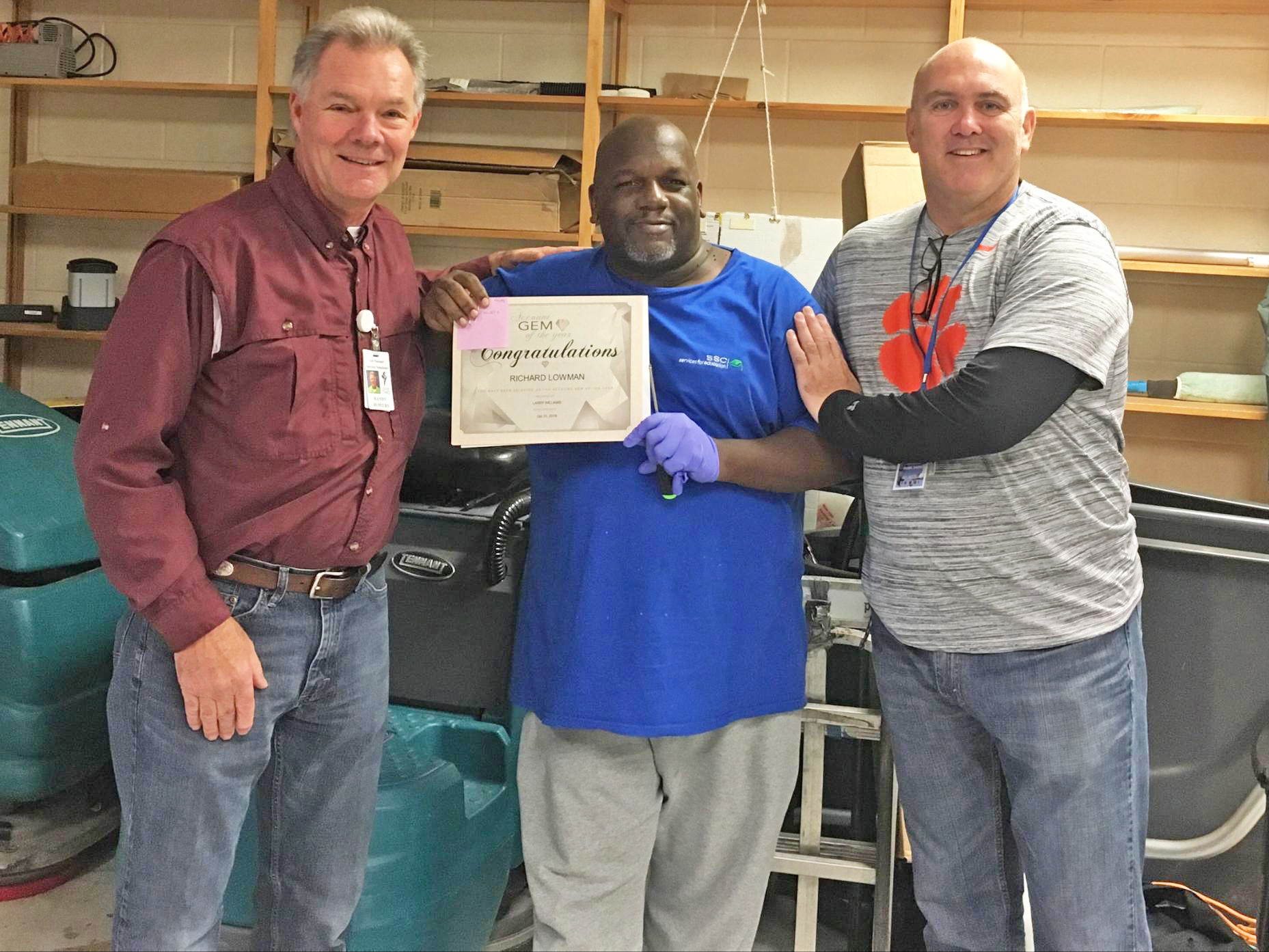 BLYTHEWOOD – Muller Road Middle School’s head custodian, Richard Lowman (center), was named Service Solutions GEM Employee of the Year. Pictured with Lowman are Randy...