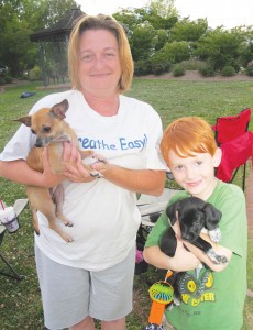 Esther Humphries and Ethan Grattis with their dogs Binky and Bella wait for the movie to begin.