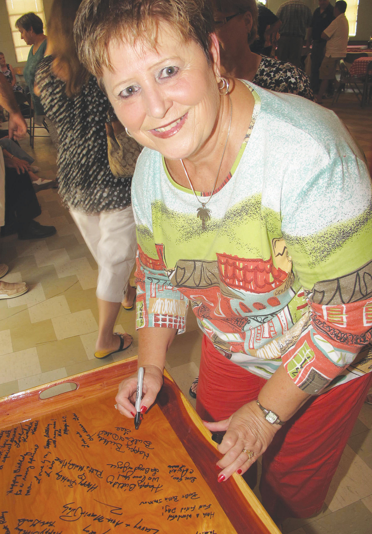 Debbie Lee signs one of Robert Moak’s homecrafted wooden trays.