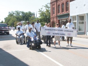 The Olympic Games of the Fairfield Healthcare Center started at the Ridgeway post office with a parade and the carrying of the Olympic torch by resident Ruby Burns. American banners lined the streets and spectators and shop owners came out from Ruff’s Hardware, the Cotton Yard Market and the First Citizen’s bank to cheer on the marchers. A hydration station was sponsored by Regional Ambulance who also used their vans to transport the marchers to their starting point. Each of the participants wore a white T-shirt with the words “Olympic Games” and the emblem of the Olympic rings on them. The shirts were made by Roger Browning of Browning Tee’s. Thanks to the support and efforts of the Fairfield County Sheriff’s Office, deputies Steve McDonald, Rick Gibson and Ronald Mull closed the street to traffic and an escort deputy car lead the group with siren wailing. Due to an illness in the family, Mayor Charlene Herring was unable to attend the event this year.