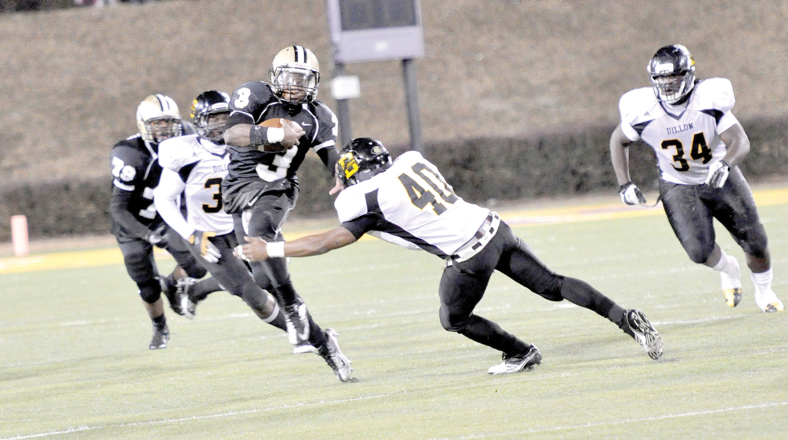 DeAndre Belton (3) delivers the stiff-arm to Dillon’s Avery Benjamin (40).
