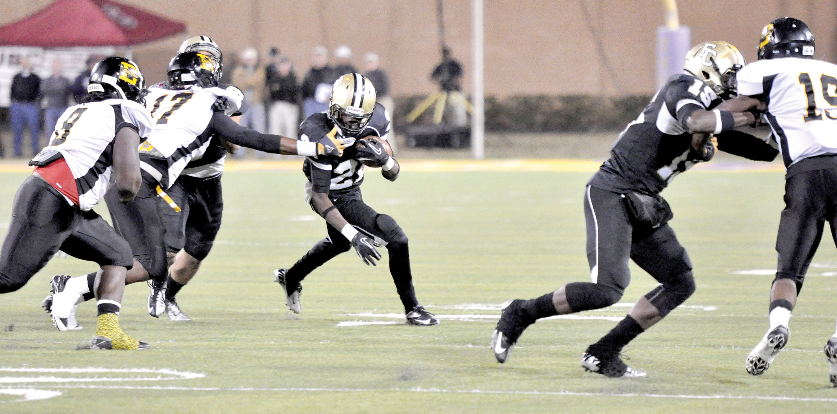 Joseph Young (21) fights off a Dillon facemask.