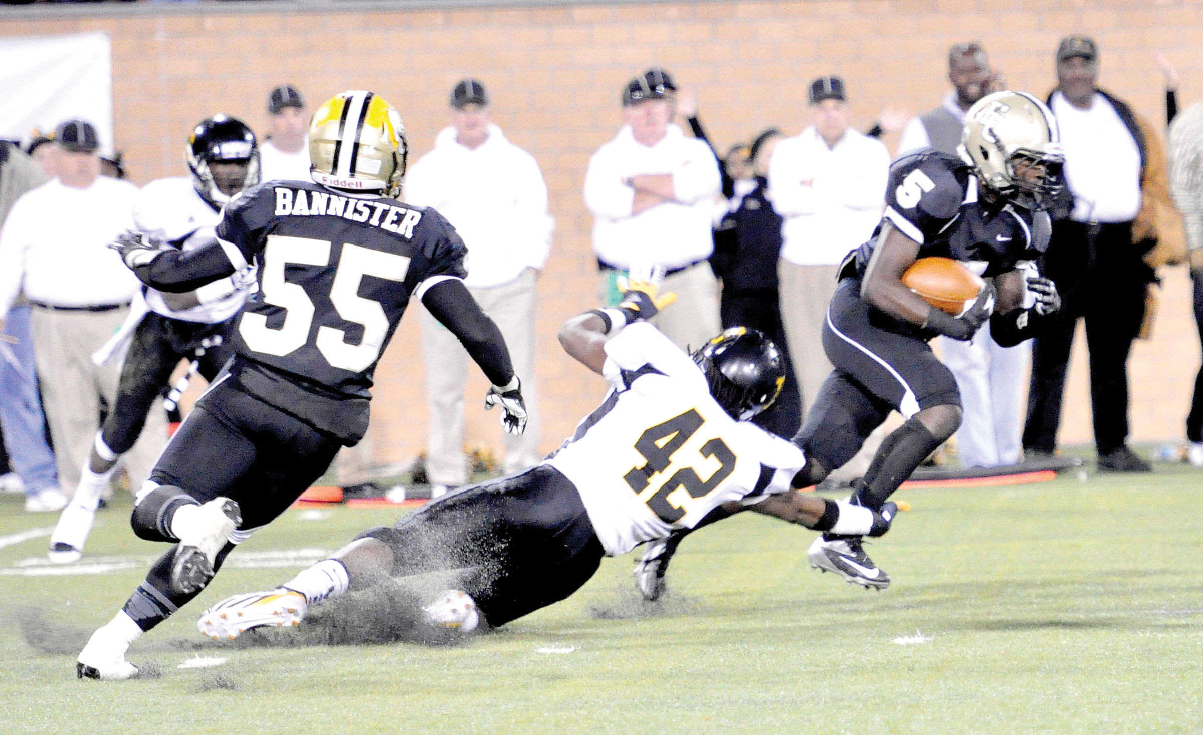 Dillon’s Justin Cyprien (42) makes the shoe-string tackle on JaVon Neal (5).