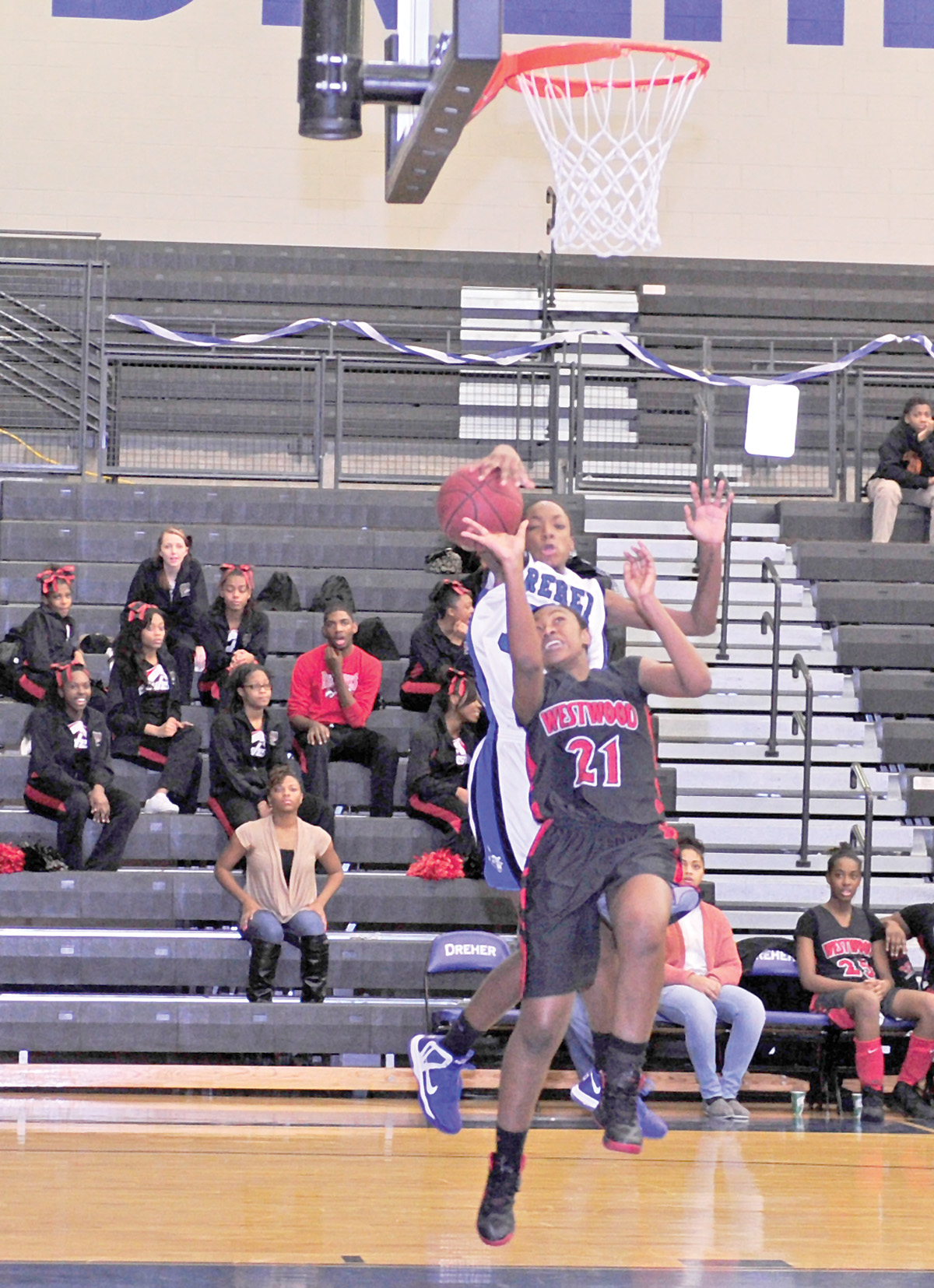 Westwood’s Aubria Myers has her layup attempt put down by Dreher’s Daja Parks Friday.