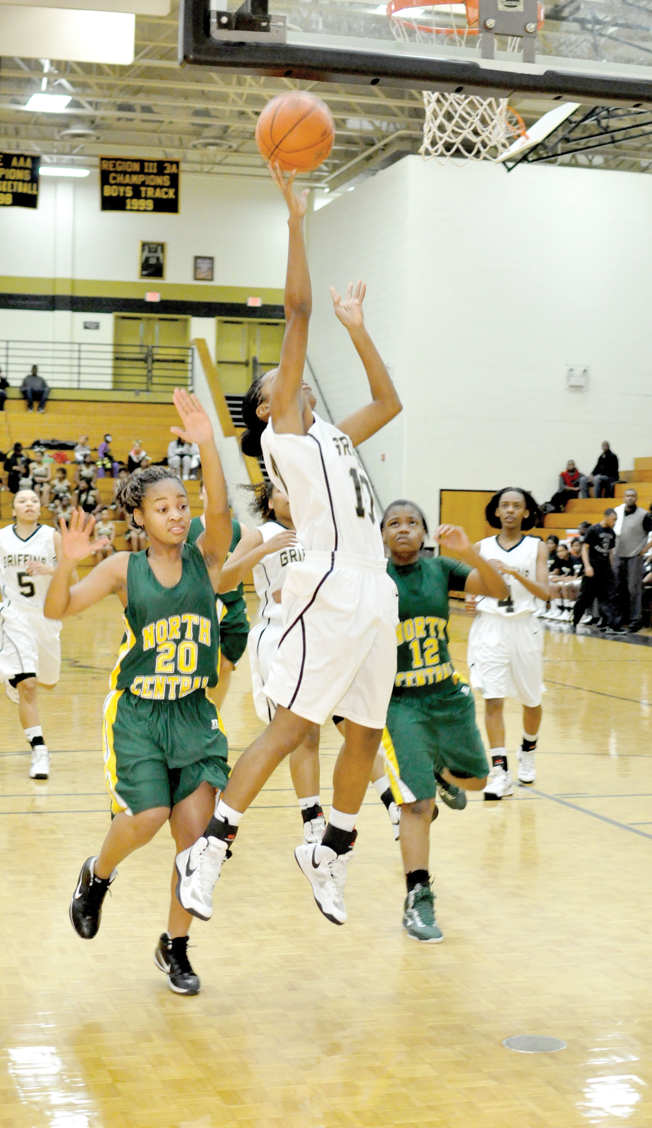Jada Martin (10) goes coast-to-coast for the Lady Griffins, converting a steal into two points against North Central.