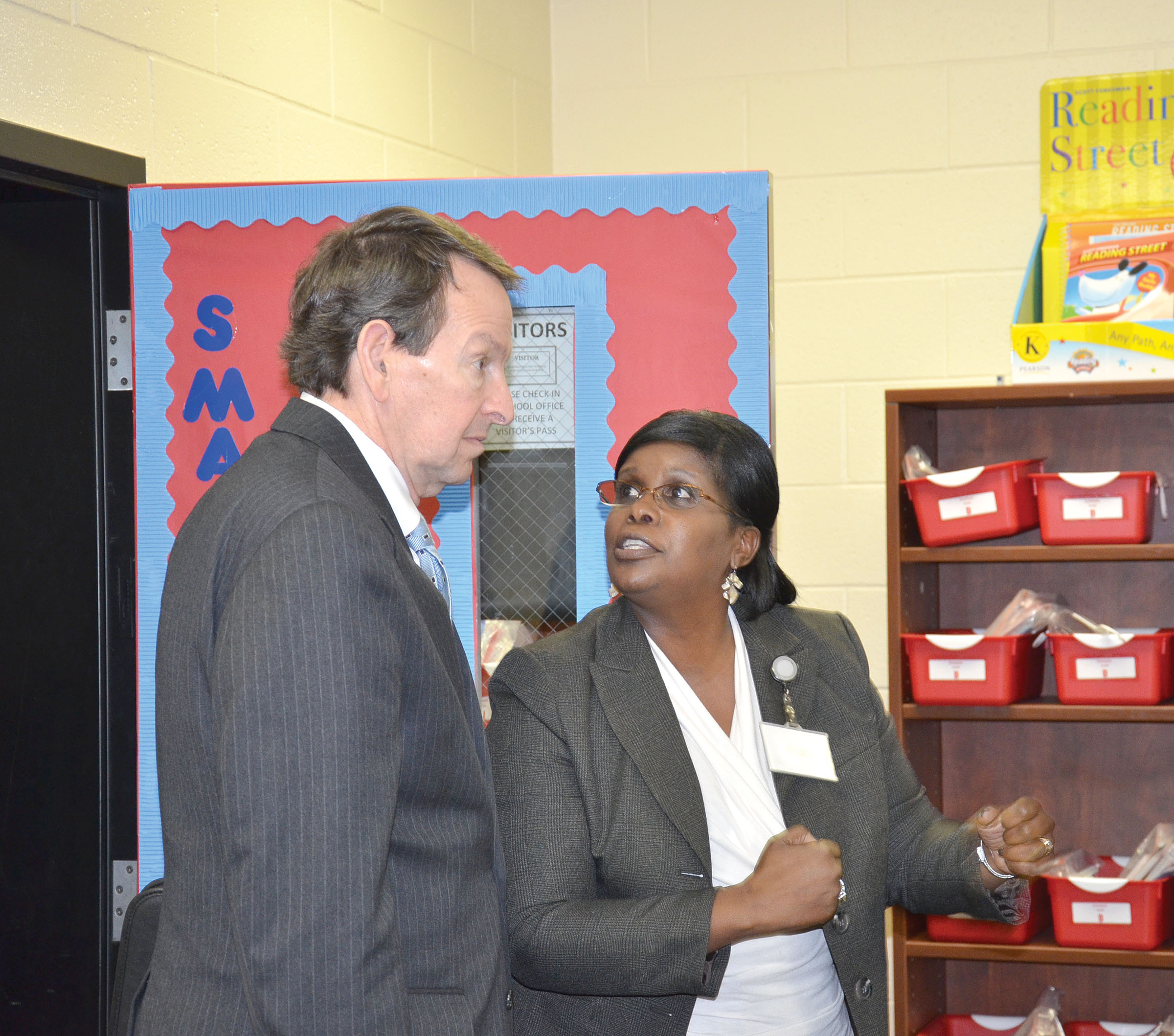 State Superintendent of Education Mick Zais (left) visited four Fairfield County School District schools Thursday, including Fairfield Magnet School for Math and Science where he met with principal Gail Whitfield (right). Dr. Zais also visited Fairfield Middle School, Fairfield Elementary School and McCrorey Liston School of Technology. Before touring each location, Dr. Zais discussed performance data with the school principal, Superintendent of Schools J.R. Green, and Board members Beth Reid and Paula Hartman.