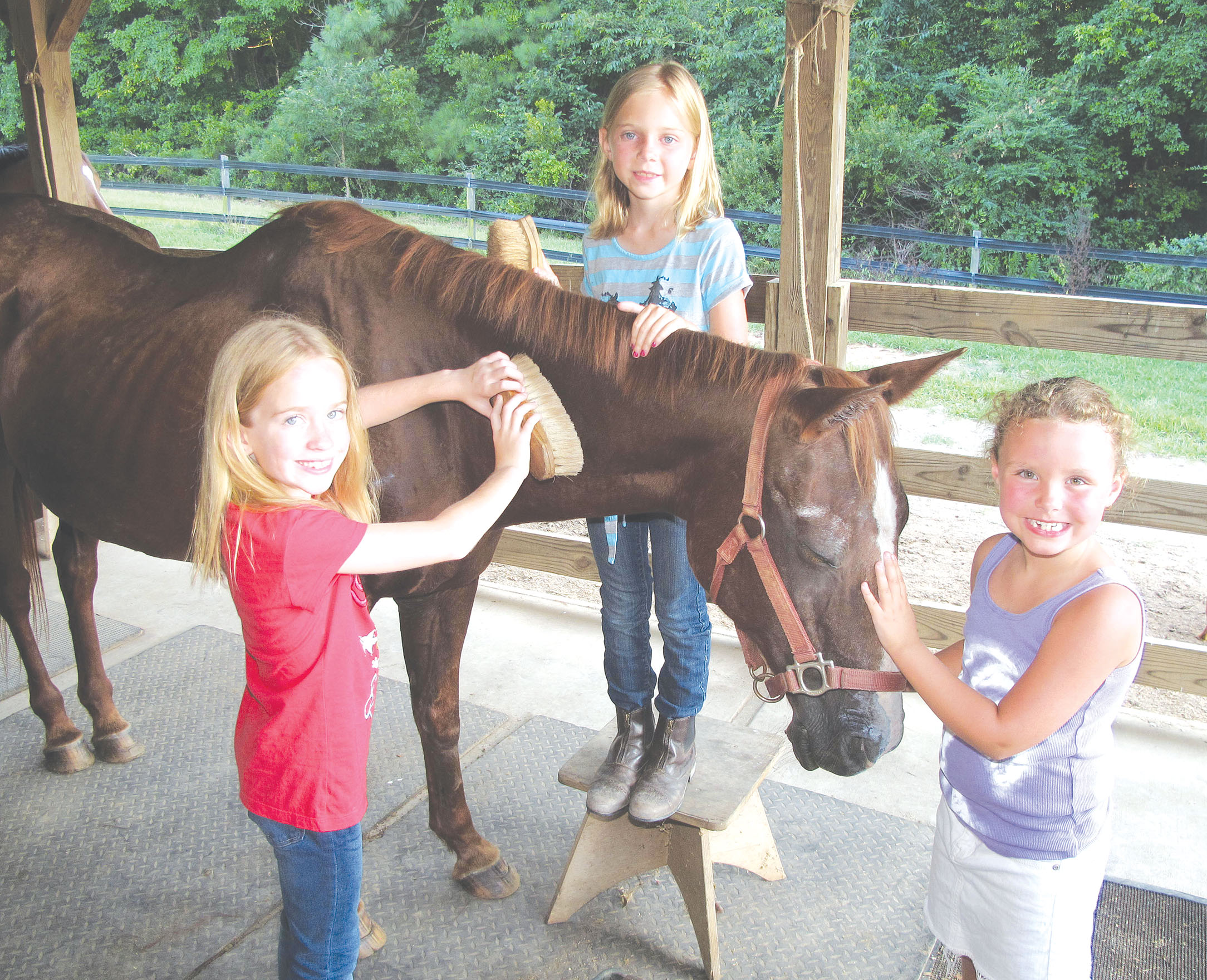 Sandra, a 20+ year old chestnut mare, dozes while Camp Grammy campers Julia Mitchell, Anna Wiseman and Sophie Sweatman give her a good grooming at Minge Wiseman’s farm in Blythewood. Julia, from Birmingham Ala., and Sophie, from Bluffton, are Wiseman’s granddaughters, in town for the week to play ‘farm’ with Anna, Wiseman’s niece, at what Wiseman calls Camp Grammy. Sandra is one of two surviving horses from a horse rescue operation carried out last month in Fairfield County by Fairfield Director of Animal Control David Brown. The other surviving horse, a 3-year-old, has been adopted by a farm in Blythewood where she’s enjoying life as a pasture companion for a retired horse. Wiseman is boarding Sandra until the end of this week, but so far there are no prospects for a permanent home. She, too, is best suited as a pasture companion, but according to veterinarian Dr. Nicole Cunningham, who has been attending to Sandra’s recovery from malnutrition and other health issues, the mare would never be suitable for riding. Anyone interested in adopting or fostering Sandra and can provide a grass pasture and a safe haven, even on a temporary basis, please call 803-635-9944. Under the county’s foster care program, food and medical supplies would be provided free of charge.