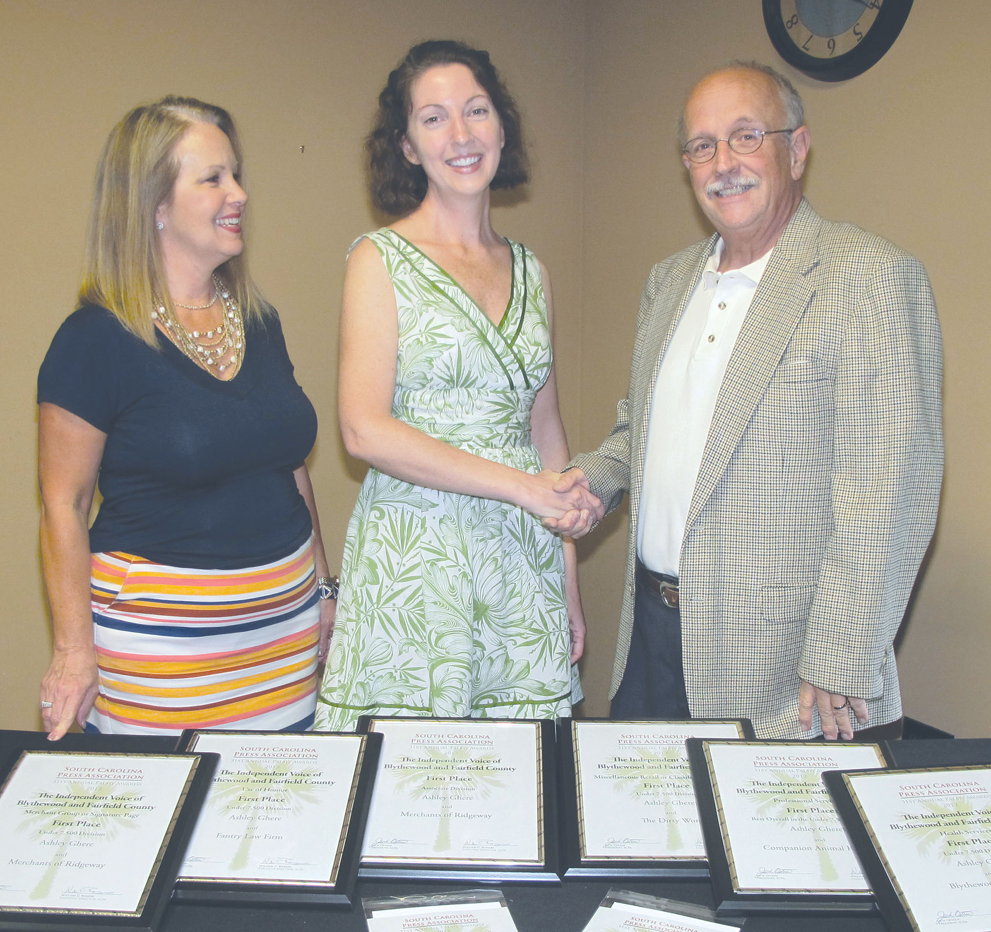 Ashley Ghere, The Voice’s graphic designer, took first place in six categories, and second and third in two other categories, in the 2012 S.C. Press Association’s Palmy Awards for advertising design. Ghere’s ad for Companion Animal Hospital won Best Overall Ad in the weekly division. Ghere was presented with her awards Monday by SCPA Executive Director Bill Rogers (right) and Alana Ritchie, SCPA Director of Advertising. See some of Ghere’s award-winning work on page 6.