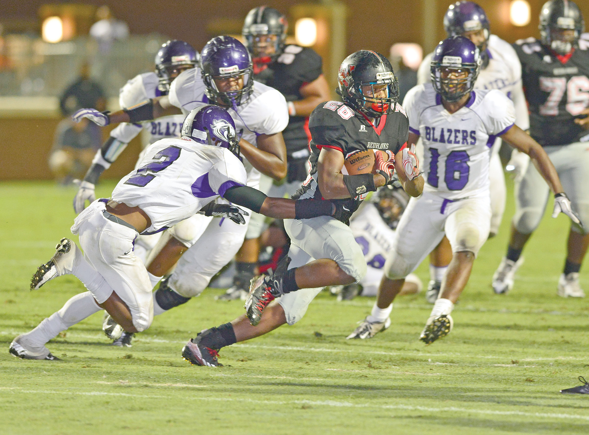 The game began well for the Redhawks, who received the ball on the initial kickoff. They moved the ball down field steadily a few yards at a time by the running ability of Brown and with forward passes to Adonus Lee. Westwood would move the chains four times on their way from their own 14-yard line to the Blazers’ 27-yard line. Patterson tried to get in the end zone on the next play but couldn’t connect with Raekwon Geter. On the next play, Patterson fired the ball to Lee, who carried it across the goal line for the first score of the game. Uncharacteristically, kicker Brandon Howard missed the point-after kick, making the score 6-0, Westwood.